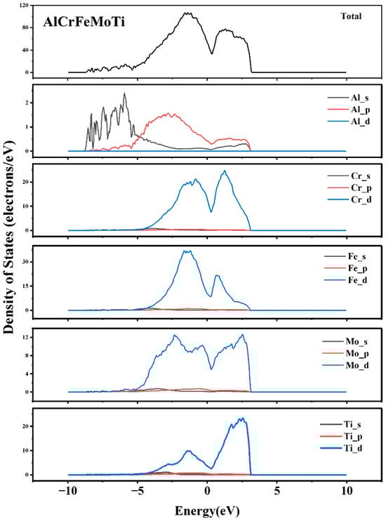 Figure 11 shows the total and partial densities of state of AlCrFeMoTi HEA. As shown in the picture, the strong peak energies near the Fermi level of AlCrFeMoTi HEA are −1.44 eV and 1.05 eV. That is to say, the pseudo-energy gap of AlCrFeMoTi HEA is 2.49 eV. Pseudo-energy gap, defined as the energy difference between two strong peaks near the Fermi level, reflects the covalent nature of the alloy system. The wider the pseudo-energy gap, the stronger the covalency of the alloy system [,]. The partial density of states of the Al, Cr, Fe, Mo, and Ti elements in Figure 11 shows the contribution of the electrons of these five elements to the total density of states of the AlCrFeMoTi HEA. It can be clearly observed from the figure that the d-orbital electrons of the Fe element contribute the most to the total density of states, followed by the d-orbital electrons of the Cr and Ti elements, and then the d-orbital electrons of the Mo element. The contribution of the three orbital electrons of the Al element is the smallest. In addition, it can be seen that the valence band near the Fermi level of AlCrFeMoTi HEA is formed after the hybridization of d-orbital electrons of Cr, Fe, Mo, and Ti, with a high overlap rate. The density of states calculation results indicate that the valence band of AlCrFeMoTi HEA is close to the Fermi level, and the number of covalent bonds between atoms is relatively small, which may lead to an increase in metal bonds. The high total density of states of AlCrFeMoTi HEA indicates its strong metallic properties.
