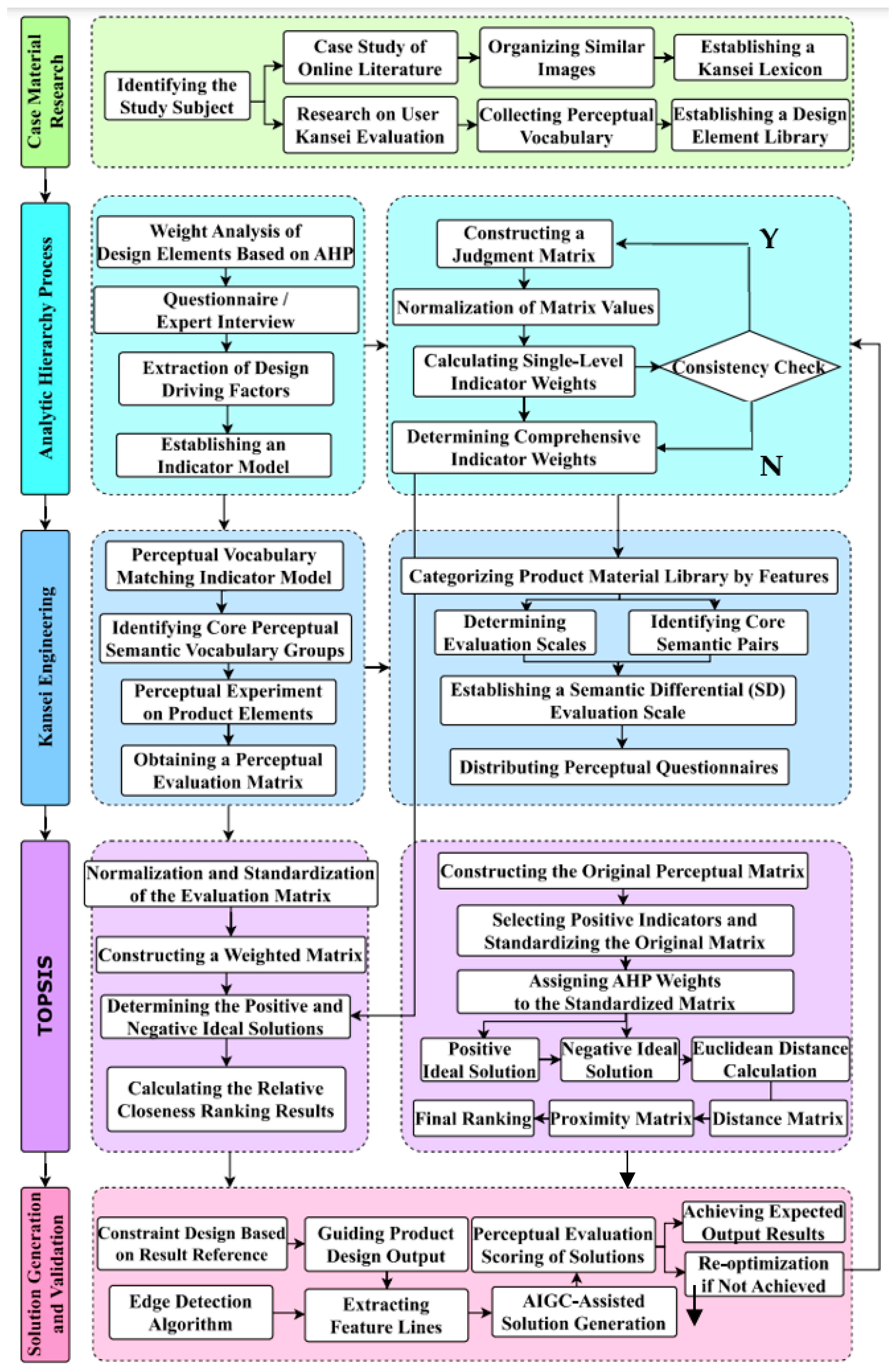 The integration of AHP-SD-TOPSIS-AIGC new energy commercial vehicle design and Kansei evaluation methods will be examined to solve the problem of perceptual coupling between new energy commercial vehicles with multiple elements, categories, and forms, to quickly obtain users’ comprehensive evaluation of multiple elements of new energy commercial vehicles, to determine the most suitable research direction, to generate multiple sets of solutions, and to guide new energy commercial vehicles to optimize in the direction of conforming to the Kansei preference of the majority of users.