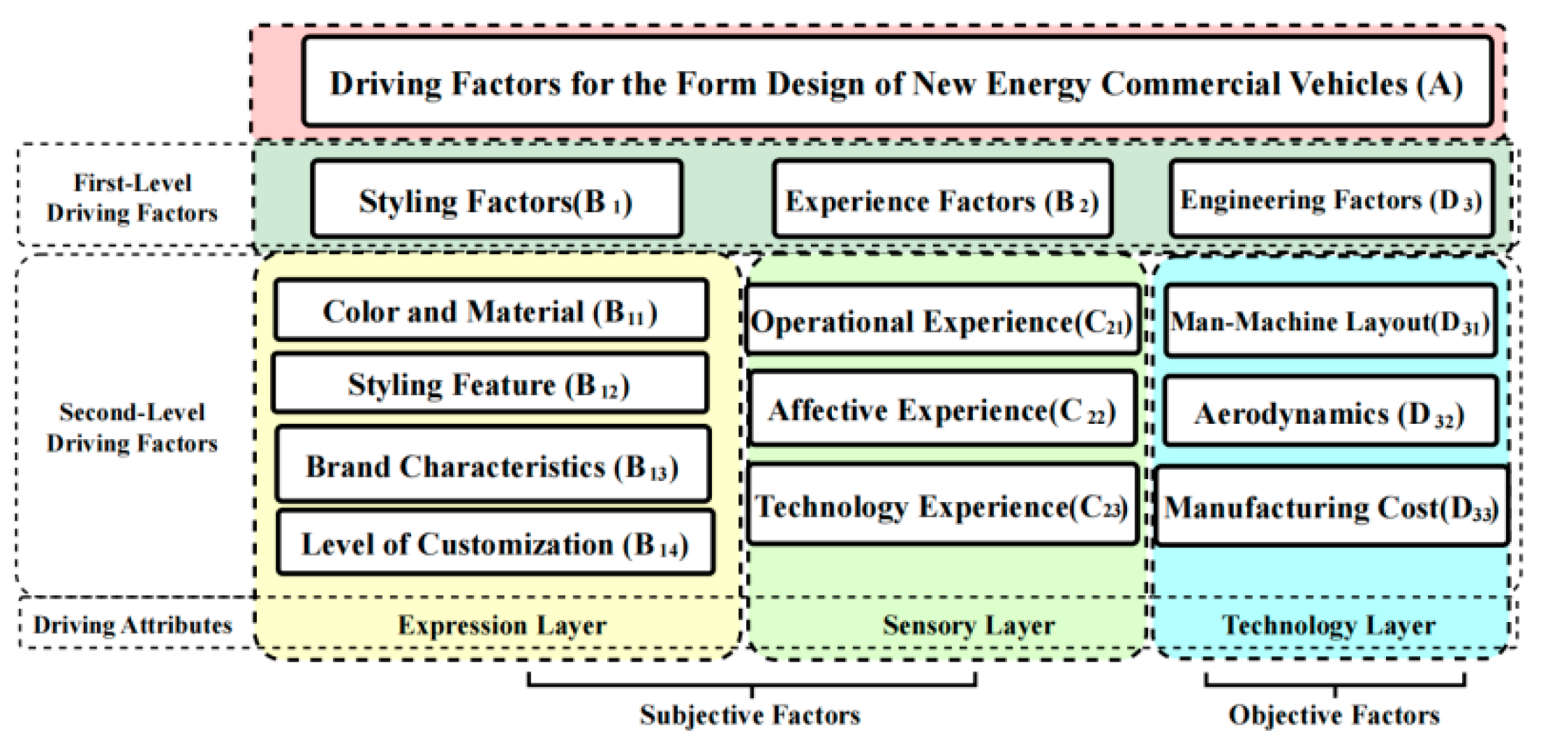 33) for the second-level driving factors, including color and material, styling features, brand characteristics, level of customization, operational experience, affective experience, technological experience, man–machine layout, aerodynamics, and manufacturing cost. The hierarchical model of the driving elements for the design of a new energy commercial vehicle body shape is shown in