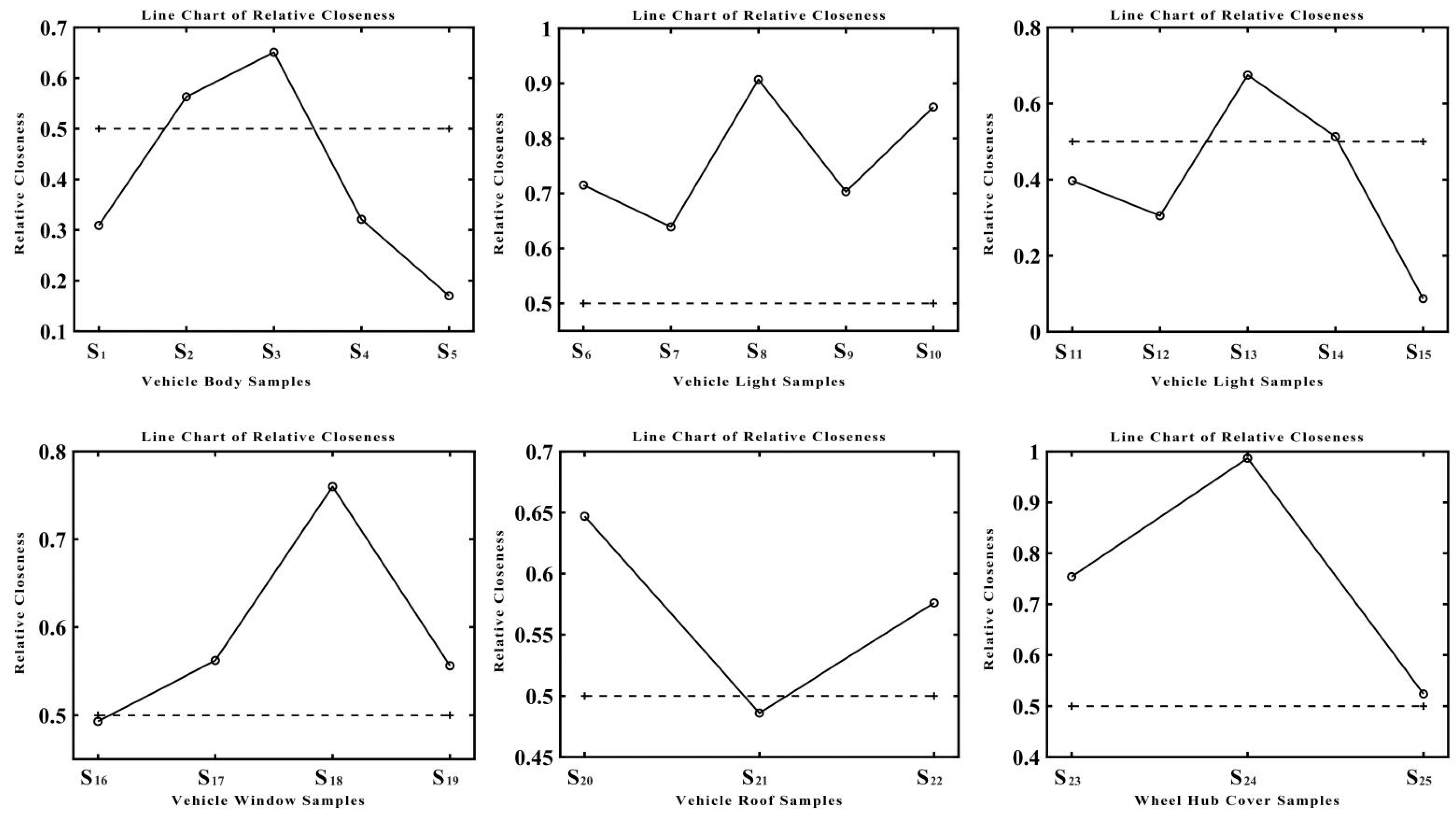 In step 4, the Euclidean distance and relative proximity were calculated using the TOPSIS multi-attribute decision-making method. The smaller the value of the distance from the positive ideal solution, the higher the coupling of body styling intentions.