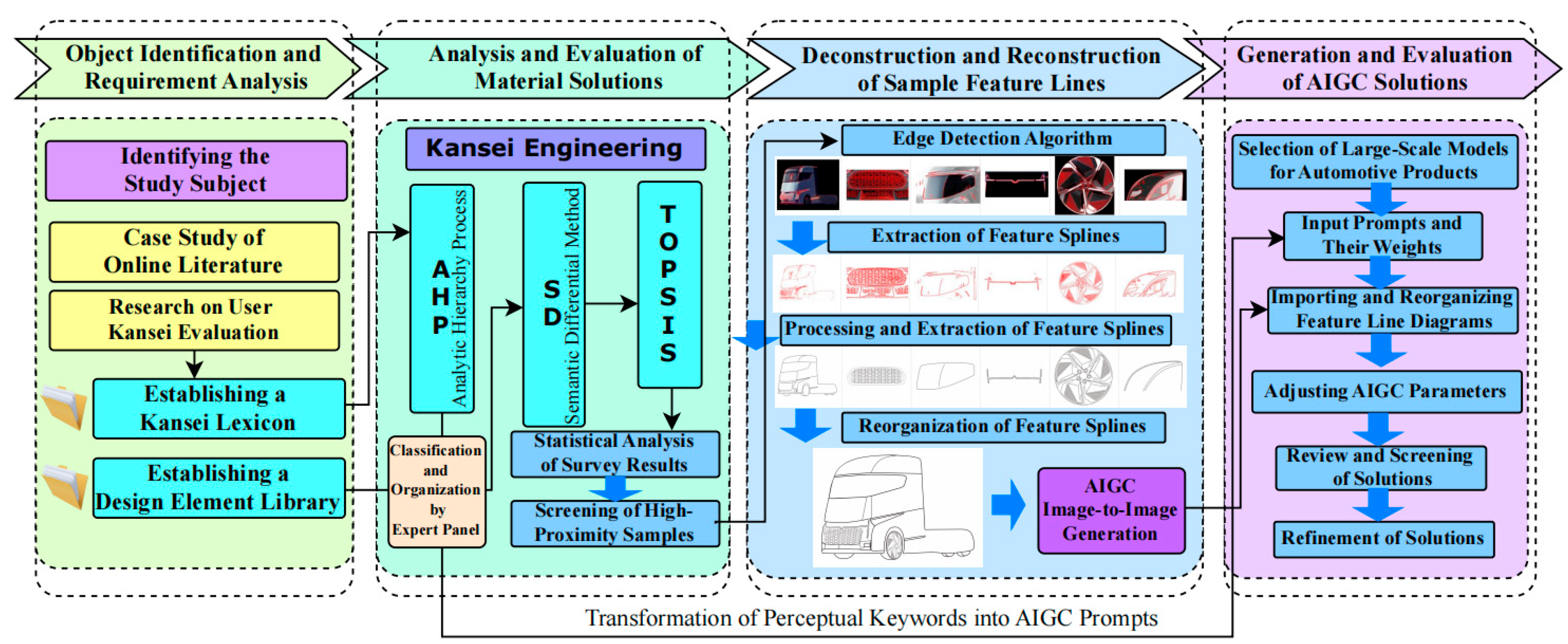 Addressing the multifaceted complexity of emotion-driven design in the body shape design of new energy commercial vehicles, this study firstly proposes an innovative method integrating AHP (Analytic Hierarchy Process)-SD (Semantic Differential Method)-TOPSIS (Technique for Order Preference by Similarity to Ideal Solution)-AIGC (Artificial Intelligence Generated Content) for morphological design. This method aims to scientifically and precisely translate users’ emotional needs into design elements for vehicle body shapes. Secondly, we extensively collect relevant information through mainstream search engines and literature searches, conducting thorough and detailed investigations and analyses to establish a sentiment evaluation sample library. This step provides abundant materials and references for subsequent morphological design. Then, based on the AHP method, we establish an index system of driving factors for the body shape design of new energy commercial vehicles. By classifying emotional vocabulary according to various levels of indicators and refining core semantic words, we further use the consistent matrix method to determine the weights of multi-dimensional factor indicators for body shape design. This process ensures that the selection of design elements not only aligns with users’ emotional needs but also embodies scientific and rational design principles. Subsequently, based on the closeness values in TOPSIS, we prioritize the design schemes and derive the style morphology with the highest coupling degree to the emotional intentions of commercial vehicle users. This step effectively enhances the pertinence and effectiveness of the design, ensuring that the design scheme precisely meets users’ aesthetic preferences. Finally, based on the symmetry of the vehicle body shape, we use edge detection algorithms to extract multiple local morphological style feature sample curves and fit their line shapes into the commercial vehicle body contours. On this basis, we utilize AIGC tools to generate innovative schemes and validate them through a case study of heavy-duty truck body shape design. The results indicate that this method can quickly generate multiple sets of design schemes that meet users’ emotional needs and complete sentiment evaluations, thereby verifying the rationality and effectiveness of the research.