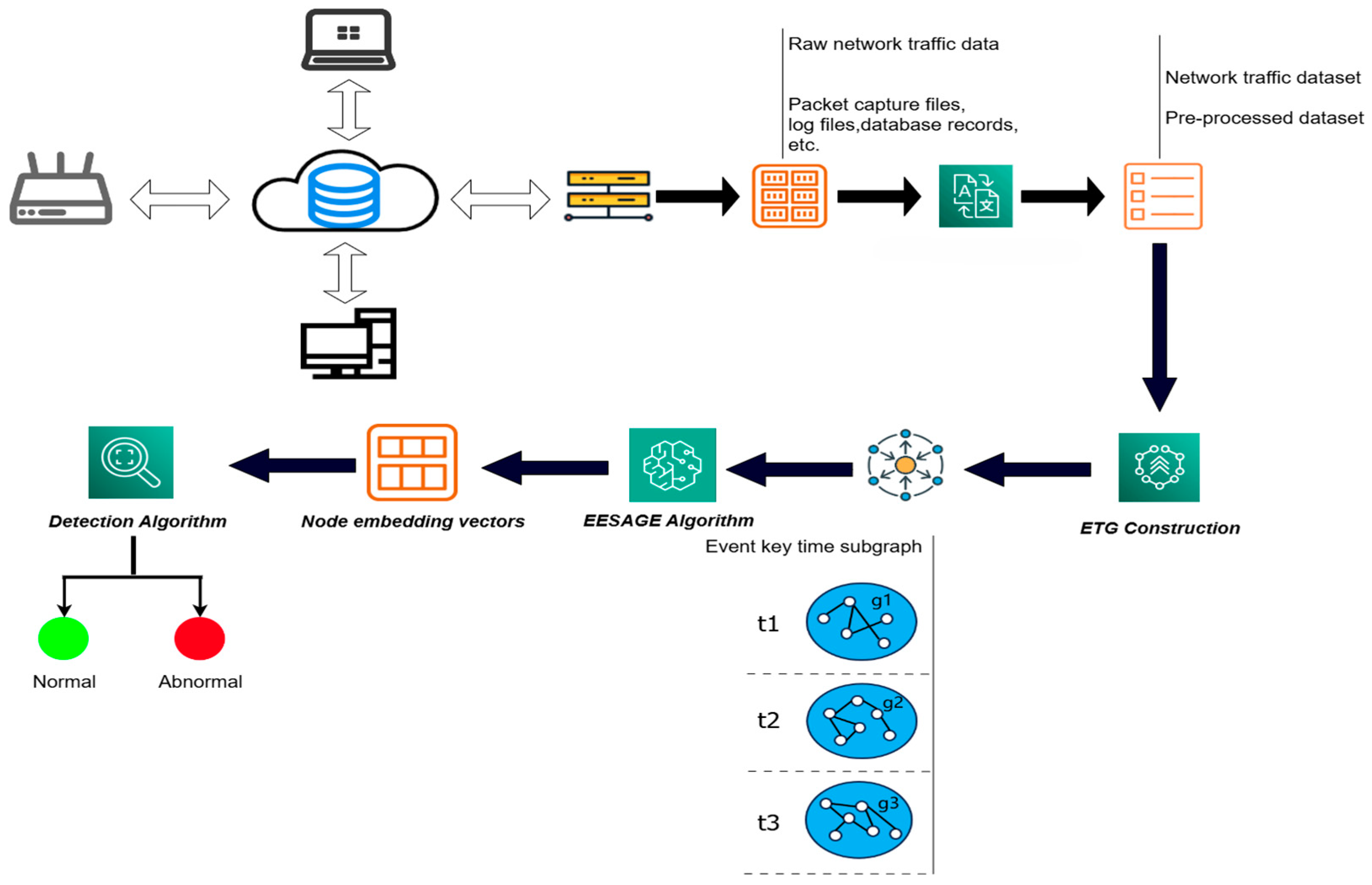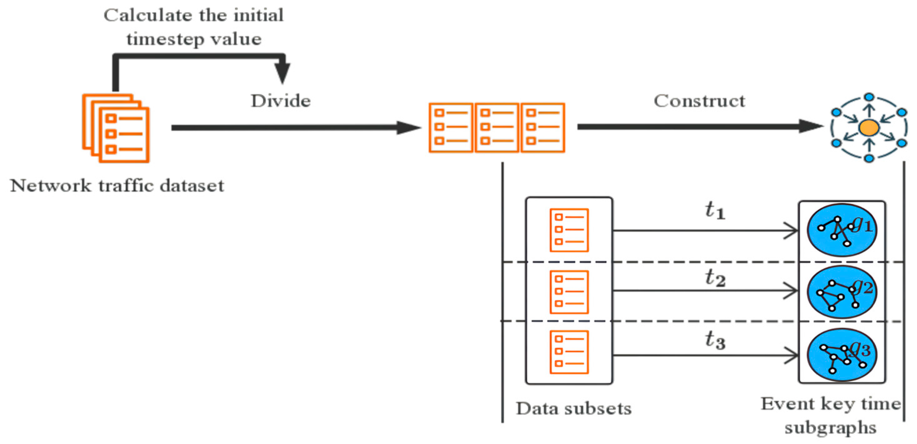 - ETG Construction: Based on the characteristics of network traffic data and network anomalies such as “device aggregation” and “activity aggregation”, the data is divided into subsets based on timestamp characteristics, resulting in several data sets within the same timestamp and across different periods. With this approach, we define a network event as a graph node and the different relationships between the nodes as edges to construct the event key time subgraph (ETG).
