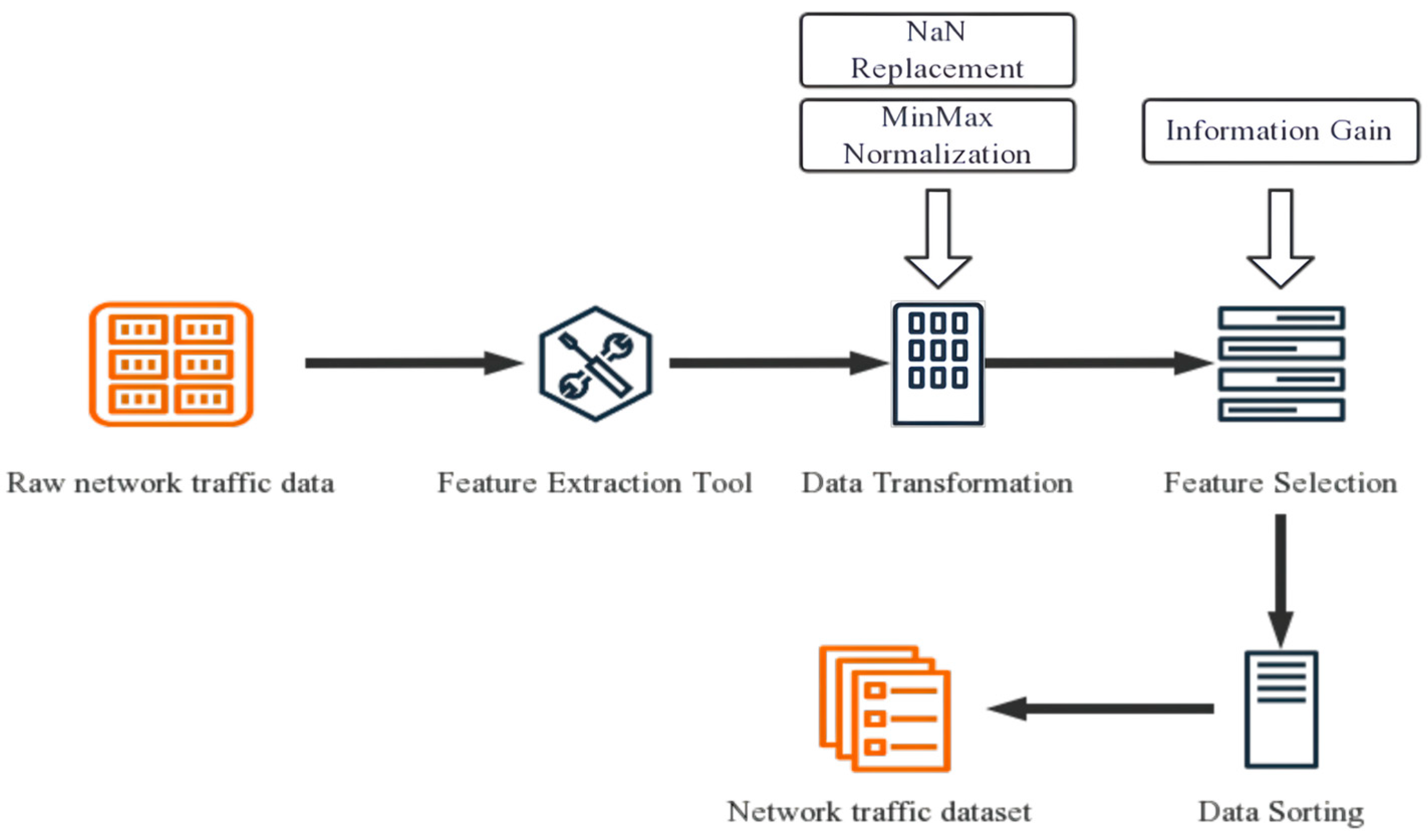 - Data Pre-processing: To address the issues of inconsistency and incompleteness in the original network data, our ETG-EESAGE model first performs data pre-processing, which includes data replacement, feature extraction, and selection. This process improves the quality of the data and enhances the efficiency of data analysis.