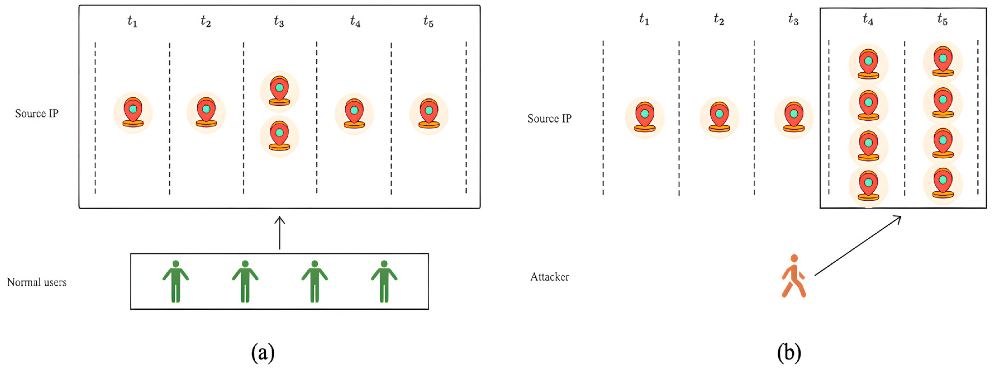 - When multiple nodes frequently initiate communication over the same protocol but with different source IP addresses, source port numbers, and the same destination IP address and destination port number within the same time period, there is a possibility of “device aggregation”. In this case, the correlation between these nodes is weak but still suspicious.