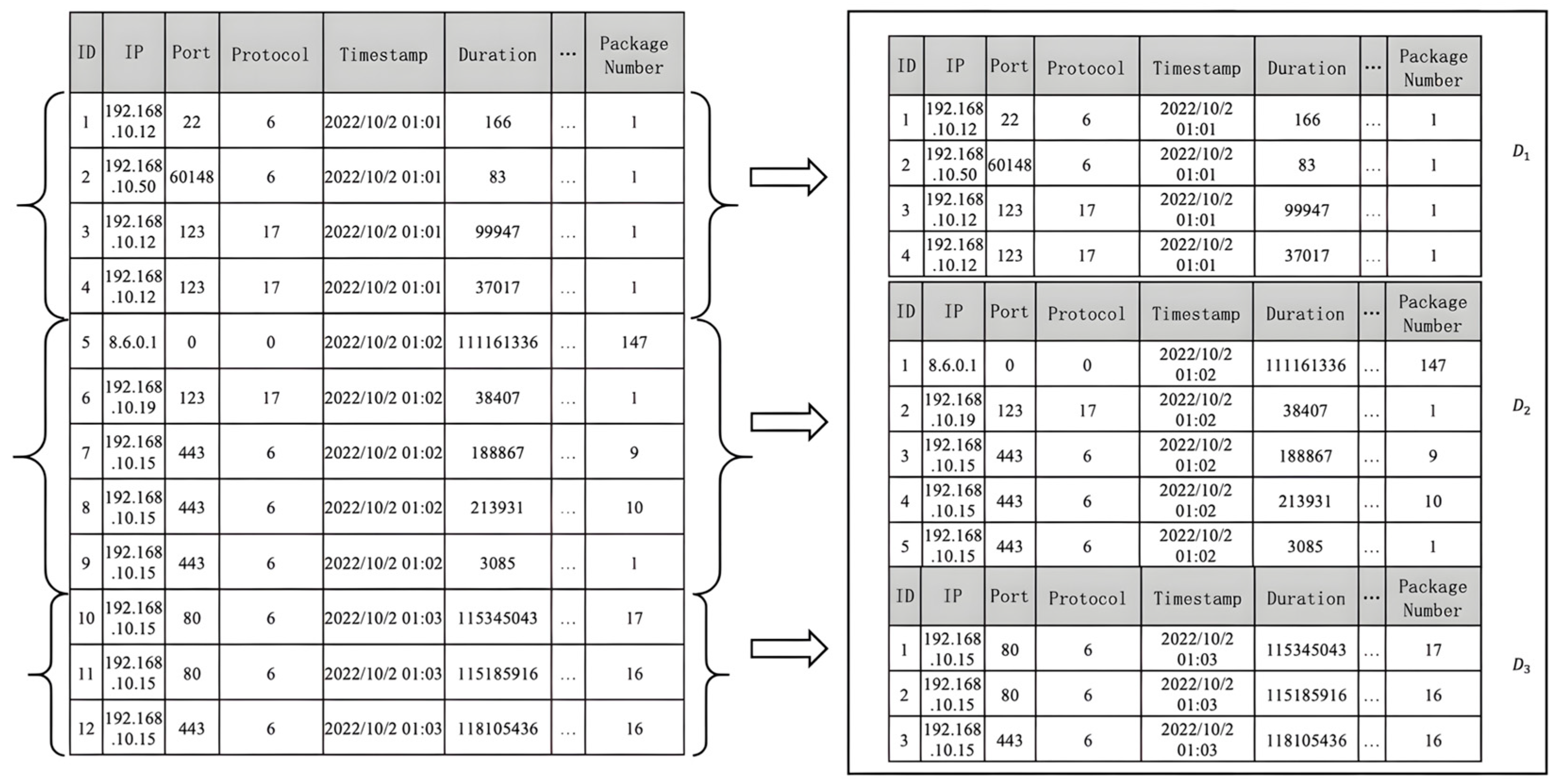 | Input: pre-processed dataset timestamp set ; timelen; timestamp; Output: data subsets ( 1: 2: 3: for do 4: if then 5: 6: else 7: 8: 9: end if 10: end for |