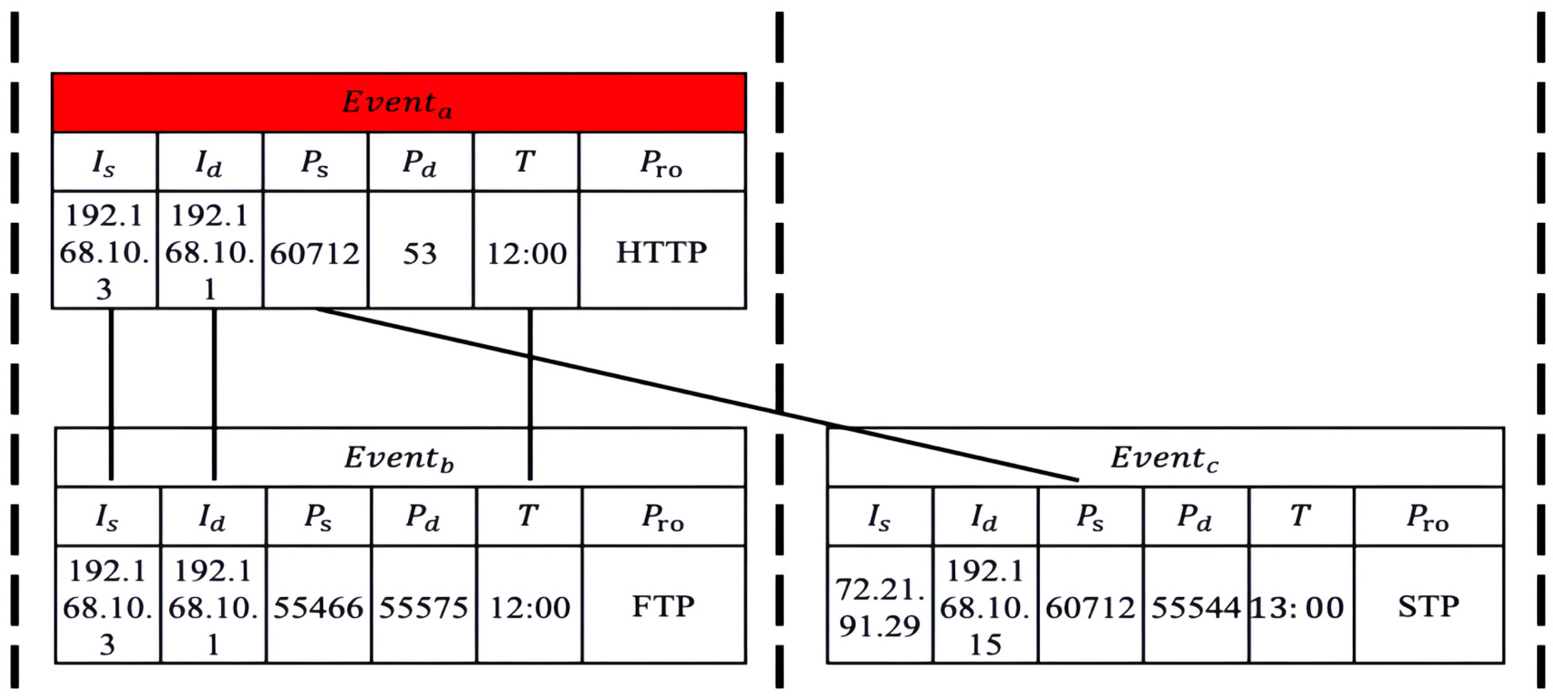 - Strong Correlation: two nodes have the same source IP address, source port number, target IP address, target port number, and protocol in the same time period.