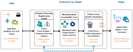 As illustrated in Figure 1, the SPFL framework integrates three core modules: a symmetry-preserving regularization module, a blockchain-based accountability layer, and a fairness-aware incentive mechanism. Together, these modules address convergence and stability at the optimization level, while simultaneously enhancing robustness and fairness at the system level, thus offering a theoretically sound and practically valuable solution for decentralized AI networks.
