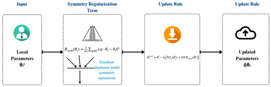 A regularization gradient term is added to local SGD, stabilizing update directions. As illustrated in Figure 2, the symmetry-preserving module takes local parameters as input, applies the group-theoretic regularization term, and integrates it into the update rule. The updated parameters are then uploaded to the server. This architectural flow clarifies how the mathematical formulation in (3) and (4) is operationalized during client training. Intuitively, this process aligns gradients of clients that share structurally equivalent features, as illustrated by the schematic in Figure 2.