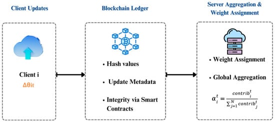 Illustrated in Figure 3, the blockchain audit module follows a three-step process: (1) clients upload their local updates , (2) the blockchain ledger stores the corresponding hash values and update metadata, while smart contracts verify their integrity, and (3) the server performs weight assignment and global aggregation based on validated contributions. This design ensures transparency, immutability, and robustness against malicious behaviors in decentralized environments.