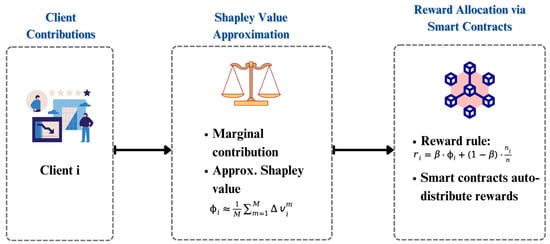 Illustrated in Figure 4, the fairness-aware incentive module first collects client contribution signals, then estimates approximate Shapley values to evaluate marginal contributions, and finally applies the reward allocation rule (9) via smart contracts. This process guarantees that rewards are distributed proportionally to both contribution and participation, thereby sustaining collaboration in heterogeneous federated learning environments.
