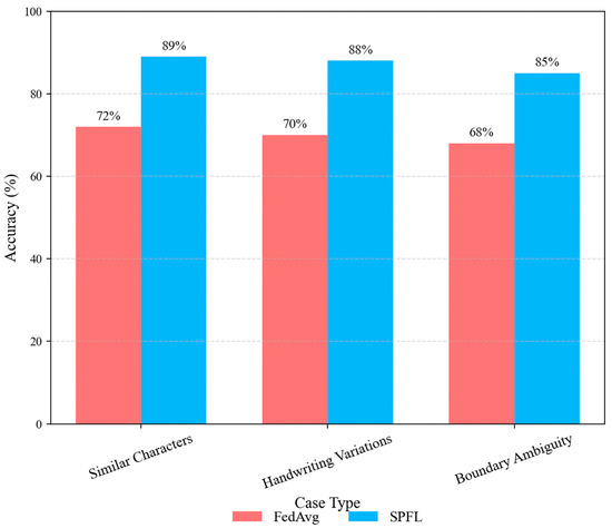 To provide deeper insights beyond aggregate metrics, we examined three representative categories of hard cases from the FEMNIST + Sketch dataset: (1) similar characters, (2) handwriting style variations, and (3) boundary-ambiguous samples. Figure 6 reports classification accuracy of FedAvg and SPFL across these categories.