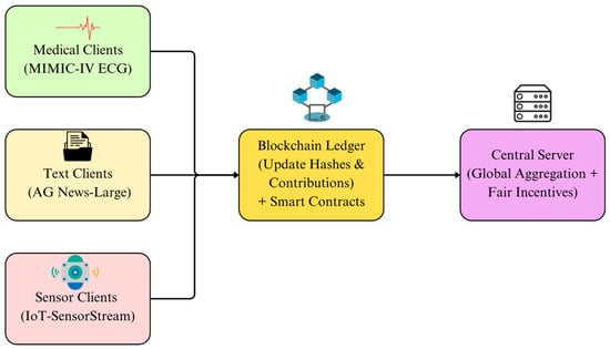In the figure, multiple clients on the left represent different data sources: medical clients hold health monitoring data such as MIMIC-IV ECG, text clients process cross-domain corpora such as AG News-Large, and sensor clients collect multimodal heterogeneous data from IoT-SensorStream. These clients perform symmetry-preserving updates locally, reducing gradient conflicts at the source. The blockchain ledger in the middle records update hashes and contribution scores, with smart contracts enabling transparent auditing, ensuring traceability and robustness of the training process. On the right, the central server aggregates blockchain-validated updates and allocates rewards according to the fairness incentive mechanism, ensuring that weaker clients receive equitable compensation.