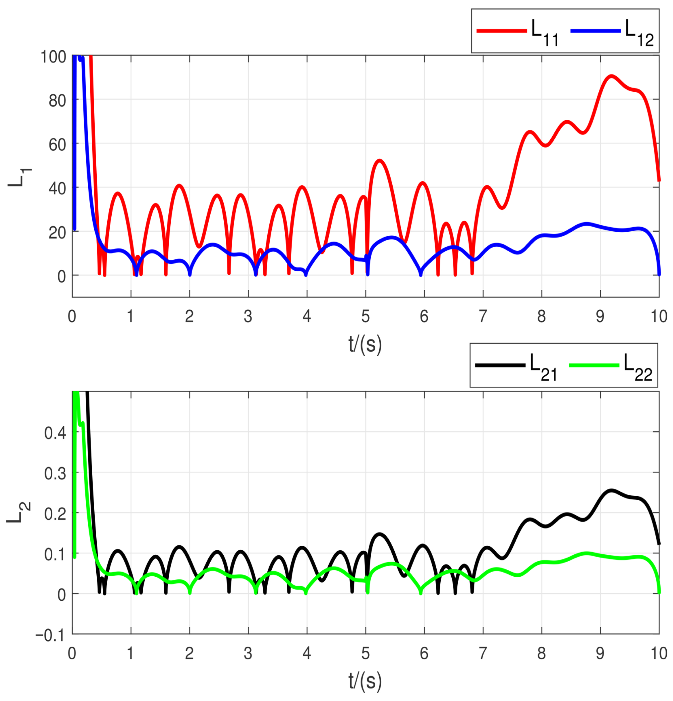 In implementation, the adaptive gains are restricted to a compact design set L 1 , min L 1 ( t ) L 1 , max and L 2 , min L 2 ( t ) L 2 , max , which can be guaranteed by gain clipping without altering the form of (16).