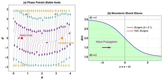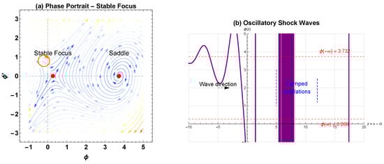 For the strong dissipation regime in Figure 6a, we solved the boundary value problem with and . The numerical solution shows a smooth monotonic transition between the asymptotic states, confirming the stable node behavior predicted by linear stability analysis. The computed eigenvalues at are , validating the stable node characterization.