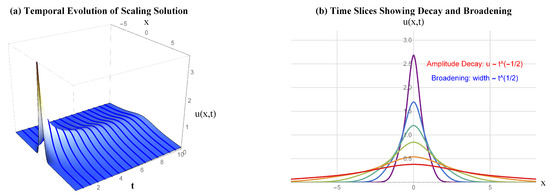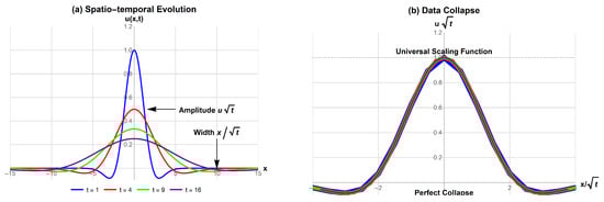 (a) Spatio-temporal evolution of the scaling solution. (b) Data collapse of the numerical solutions at different times onto the theoretical scaling function when plotted in the similarity variables vs. . The excellent collapse validates the analytical scaling prediction.