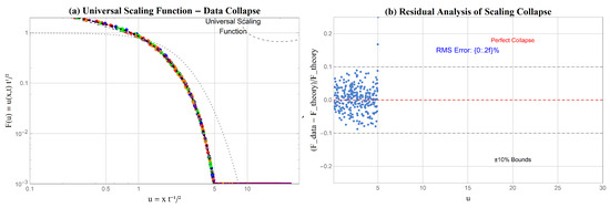 The dynamic validity of the scaling solution was tested by numerically solving the full KdV-Burgers Equation (1) with an initial condition . The solution at successive times (blue, red, green, magenta) respectively is shown in Figure 7a. When these analyses are plotted in the scaled variables versus , they collapse onto a single universal curve, as shown in Figure 7b. This collapse validates the analytical scaling hypothesis and demonstrates the self-similar nature of the long-time decay process previously illustrated in Figure 5. The mean relative error of the collapse is with maximum deviation less than , verifying the theoretical scaling hypothesis derived from Lie symmetry analysis.
