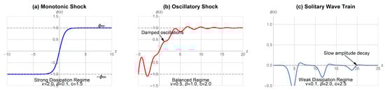 The reduced traveling wave ODE, , was solved numerically using a fourth-order Runge–Kutta method, for parameters with adaptive step size control, corresponding to the three distinct wave regimes classified in Section 6.1. For boundary value problems, we employed a shooting method with Newton–Raphson iteration to satisfy the asymptotic conditions as . The resulting analysis is plotted in Figure 6.