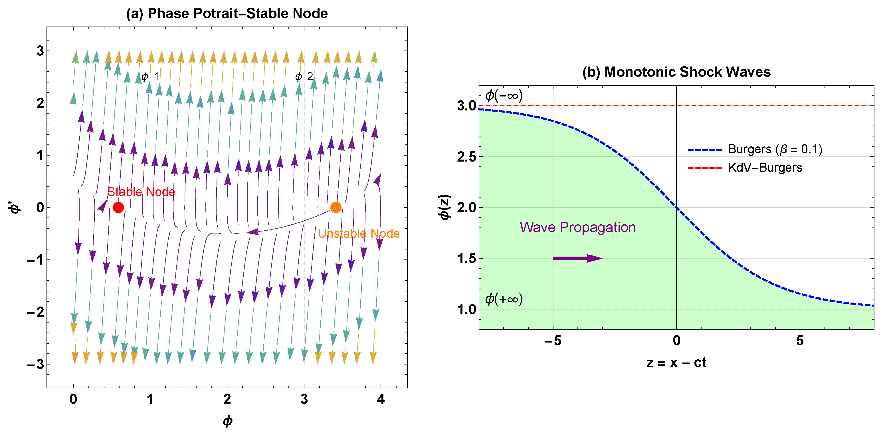 - Applications: Viscous hydraulic jumps, strong shock waves in high-viscosity fluids. Our monotonic shock solution in Figure 6a models the sudden, turbulent transition in water height observed in a hydraulic jump, where the dissipation parameter is directly related to the fluid’s viscosity.