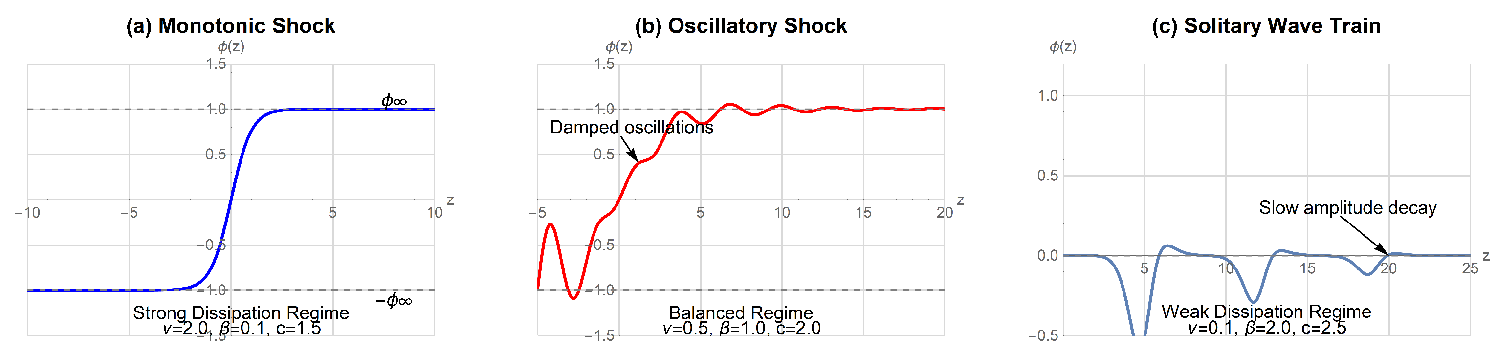 - Applications: Tsunami waves, internal ocean waves. The slowly decaying wave train in Figure 6c models internal solitary waves in the ocean, where weak dissipation allows waves to propagate over vast distances with minimal loss of form.