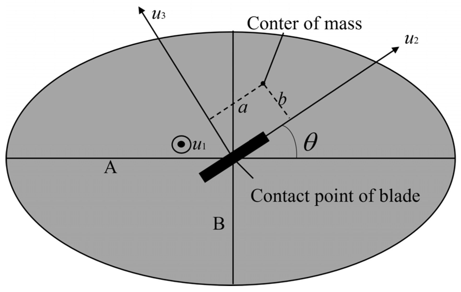 First, assume that the origin is at the center of the ellipse, and the blade makes an angle θ with the major axis of the ellipse, as illustrated in