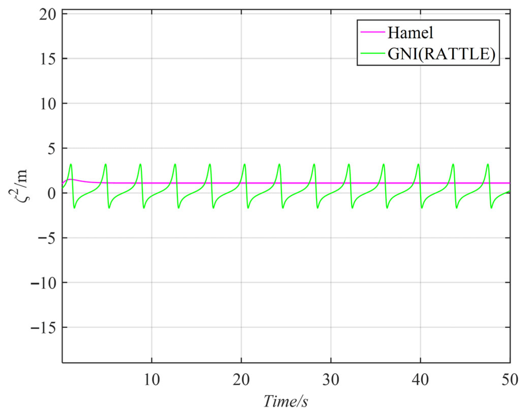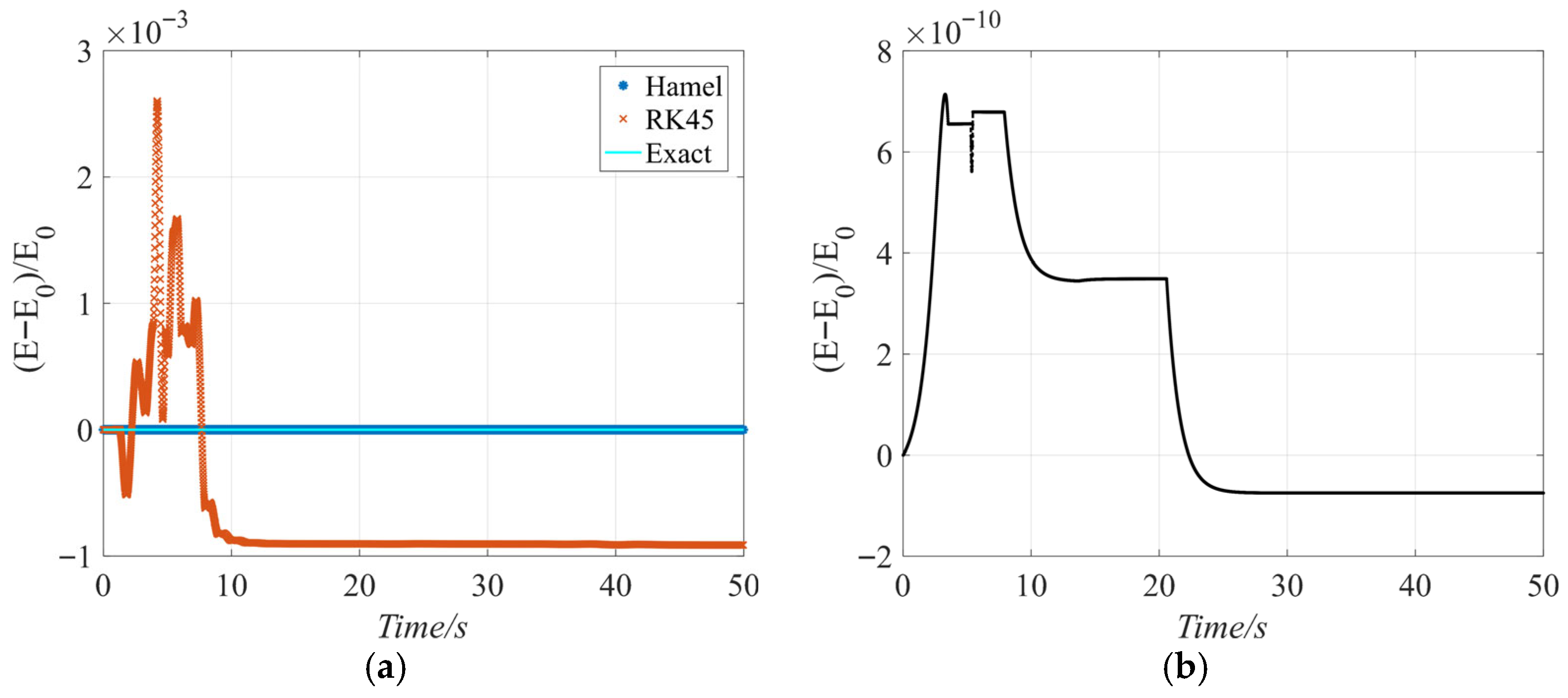 Figure 2b shows the energy error with the Hamel integrator method. For the comparison of the Hamel integrator with simulations, use the RK45 and the analytical solution. Compared with traditional numerical algorithms, the Hamel integrator has higher accuracy.