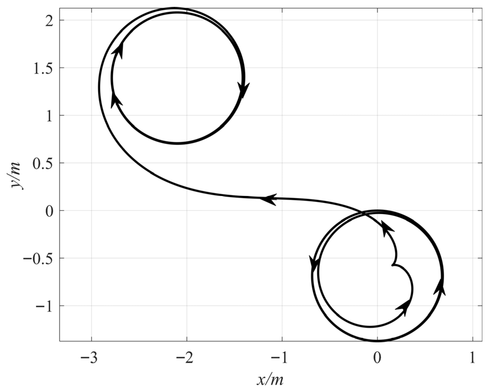 b) = (0.2 m, 0.1 m). The arrows in the figure indicate the direction of the sled’s movement. The same applies to the following figures. The classical sleigh trajectory is an asymptotic straight line. In a potential flow environment, due to the coupling terms induced by added inertia, the trajectory of the elliptic sleigh displays asymptotic evolution from one circular motion to another one, in opposite directions. The Hamel integrator exhibits the unique dynamic phenomenon of asymptotic circular motion under potential flow.