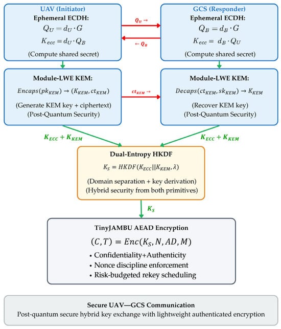 - Key Encapsulation Mechanism (KEM): HLCAD++ integrates the Module-LWE–based CRYSTALS-Kyber512 scheme, providing NIST Level 1 post-quantum security (≈AES-128). The Kyber512 public key is 800 bytes, and its ciphertext is 768 bytes, achieving an optimal balance between communication overhead and computational feasibility for UAV-class processors. This lattice-based KEM is hybridized with ECC-based ECDH (Curve25519, 32-byte public keys) to achieve resilience against both classical and quantum adversaries. The resulting key-exchange payload is approximately 1.5 kB per session, remaining well within typical UAV telemetry bandwidth constraints (≤256 kbps). Performance and bandwidth estimations were derived through software-level simulations using the NIST PQC reference parameters under UAV-specific constraints.