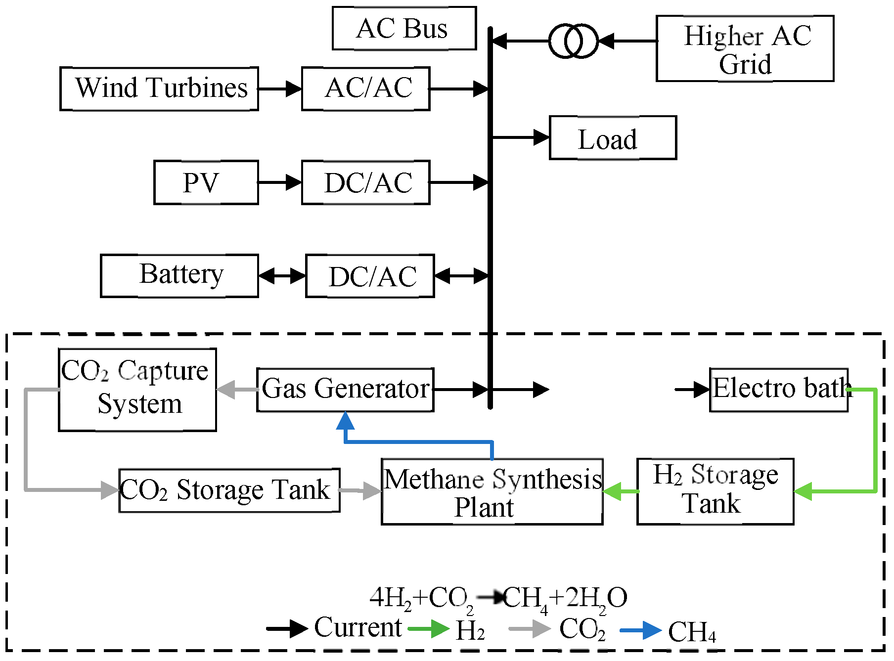 A core innovation of the microgrid model proposed in this paper is the synergistic coupling of CCS and P2G technologies. This integration establishes an internal ‘carbon cycle’: CO2 emitted by the gas turbine is captured by the CCS, and the captured CO2 is subsequently utilized as a feedstock in the P2G process. There, it combines with H2—produced via water electrolysis powered by renewable energy—to synthesize carbon-neutral methane (CH4). This pathway not only reduces the system’s net carbon emissions but also enhances the accommodation capacity of renewable energy, achieving synergistic optimization of energy and environmental objectives.