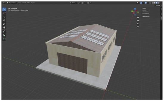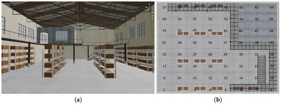 In this work, a warehouse was chosen as the industrial scenario. A 3D model of the warehouse with dimensions of 36.4 m × 27.9 m × 12.6 m was developed in the Blender environment (Figure 2). The warehouse walls and floor are made of concrete, while the staircase, roof, support pillars, entrance garage door, and the walls of the office on the second floor are made of metal. Metal racks were chosen as one of the most common objects for a sparse industrial scenario []. These 3-meter-high metal racks (1.2 m × 3 m footprint) have four storage levels, each holding two cardboard boxes (1.2 m × 0.8 m × 0.5 m, material: wood) (Figure 3a). The distance between the top box and the roof support is about 5.6 m. The distance between adjacent racks in a row is 0.9 m, with 5.2 m between rows.