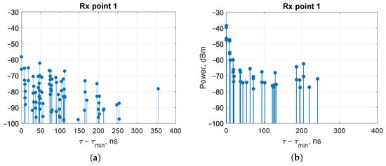 The power delay profile for the multipath communication channel between the transmitter and receiver at point #1 is shown in Figure 5 for a transmitter power of 0 dBm ( = 2.4 GHz). The x-axis shows the ray delay value relative to the first arriving ray with the minimum delay .