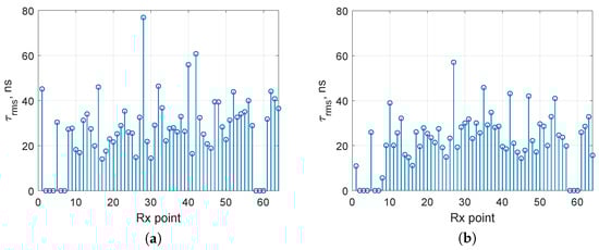 Figure 6 shows the values of the RMS delay spread for each receiver position (zeros correspond to points where no measurements were taken). With a sampling rate of = 30.72 MHz, as adopted in the LTE standard, and a number of samples per symbol = 10, the symbol duration T will be 325.52 ns. Therefore, for a frequency-selective channel, the RMS delay spread must be at least 32.55 ns. Thus, there are 21 receiver points where the InF-SH channel can be considered frequency-selective under these parameters (Figure 6a). Reducing the Tx antenna height to 1.5 m establishes a dominant line-of-sight (LOS) condition across most of the area (Figure 7), resulting in a decreased RMS delay spread. Only 9 receiver points correspond to frequency-selective channel (Figure 6b).