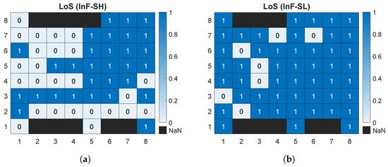 Number of line-of-sight (LoS) rays at each receiver point for InF-SH (a) and InF-SL (b).