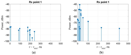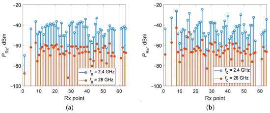 As the carrier frequency increases, the propagation loss of the rays also increases, leading to a decrease in the power of the received rays and a reduction in the overall signal power. For instance, transitioning from = 2.4 GHz to = 28 GHz for InF-SH scenario results in a decrease in received signal power up to 30 dB (Figure 8a). Transition to InF-SL scenario provides an increase in received signal power due to reduction in propagation path distance (Figure 8b). However, such a variation in received signal power has practically no effect on the values of the RMS delay spread.