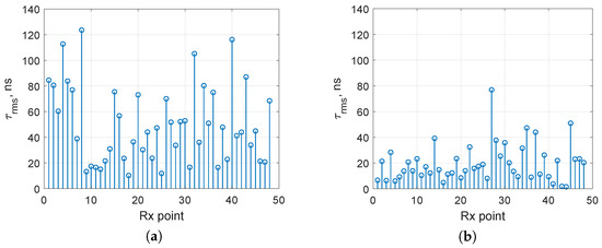The RMS delay spread rather depends on the volume of the environment and the location of obstacles than on the carrier frequency. So, the RMS delay spread becomes higher in conditions of an increased number of obstacles including smooth metallic surfaces compared to a sparse scenario (see Figure 6 and Figure 10). These obstacles lead to a reduction in the number of points with line-of-sight conditions (Figure 7 and Figure 11). It correlates with the statements from []. In InF-DH case, 32 from 48 receiver points correspond to a frequency selective channel (Figure 10a). Similar to sparse scenarios, lowering the transmitter antenna height in dense scenarios also reduces the RMS delay spread by establishing LoS conditions at more locations (Figure 11): there are only 7 receiver points with a frequency selective channel (Figure 10b).