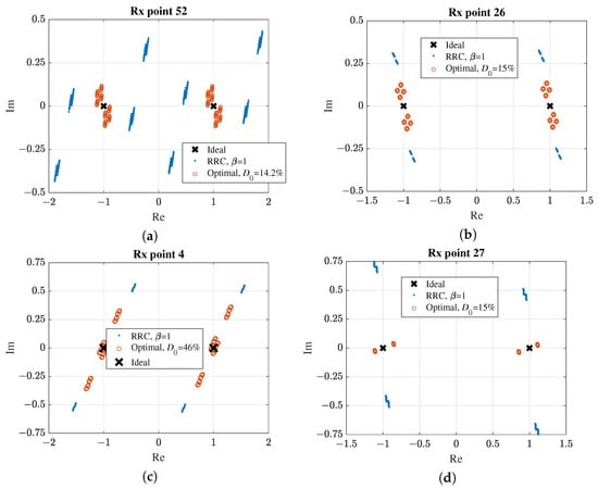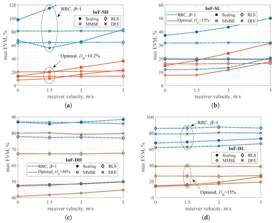 If the pulse length is longer than symbol duration T, intersymbol interference (ISI) occurs. Typically, the internal ISI is controlled by the constraint on correlation coefficient [,,]. In this research, we propose the constraint on the total distortion, which includes components from the multipath channel and from the internal ISI. The level of total distortion can be assessed using the EVM metric between the received estimates of the modulation symbols, , and their true values, . Higher EVM values, indicating a greater distance between the received and ideal symbols, result in a higher bit error rate []. The maximum EVM required for correct demodulation depends on the signal constellation. For QPSK, the maximum EVM is specified as 18.5% []. This threshold is also applicable to BPSK, as the minimum Euclidean distance between constellation points is identical for both modulations.