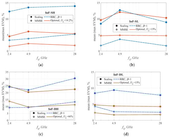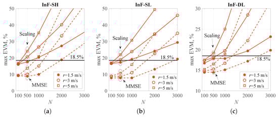 The higher the EVM value, the greater the distance between the ideal symbols and their estimates, which leads to a higher bit error rate []. Unless otherwise specified, the parameters used in this paper are = 10, = 100 and N = 1000.