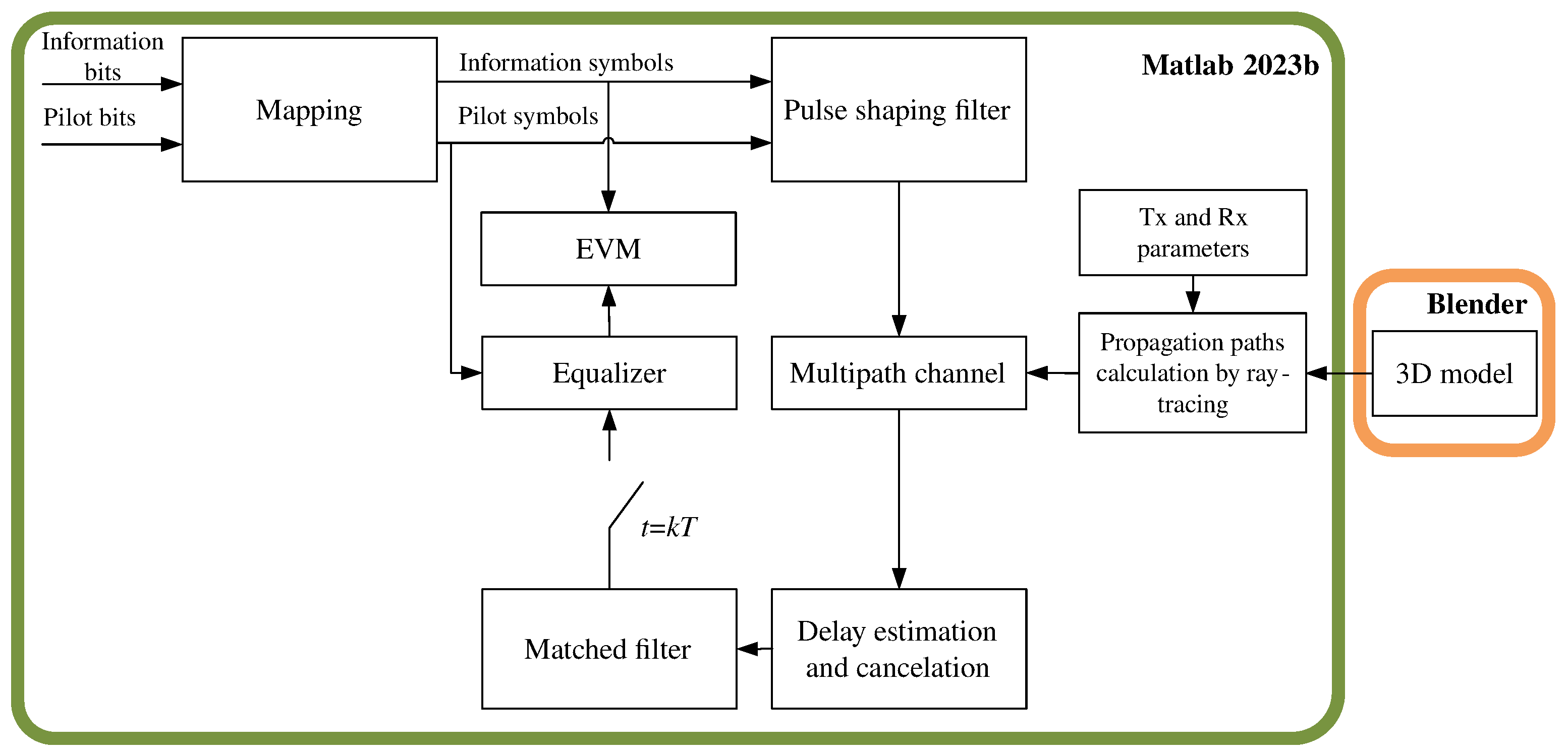The formed baseband signal s ( t ) passes through a multipath channel, which is generated based on signal propagation paths pre-calculated using the ray-tracing method for given transmitter and receiver parameters. These parameters include the coordinates of the transmitter and receiver, antenna type, transmitter power, carrier frequency, and sampling rate. The maximum number of reflections and diffractions is also set. The focus is on distortions caused by the multipath nature of signal propagation; therefore, additive white Gaussian noise (AWGN) is not considered at this stage.