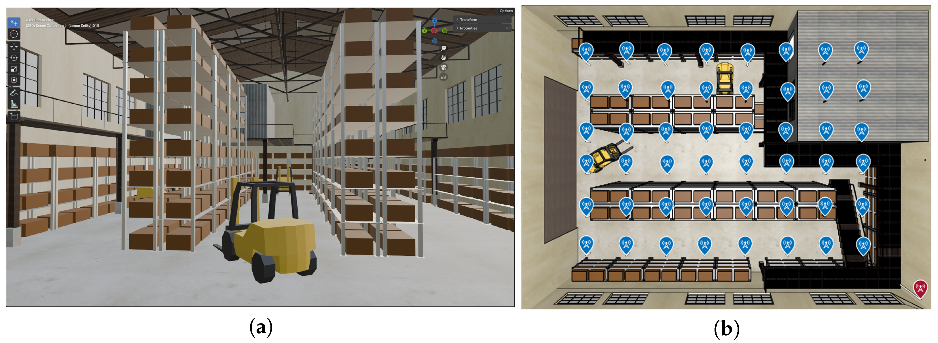 In this work, a warehouse was chosen as the industrial scenario. A 3D model of the warehouse with dimensions of 36.4 m × 27.9 m × 12.6 m was developed in the Blender environment (Figure 2). The warehouse walls and floor are made of concrete, while the staircase, roof, support pillars, entrance garage door, and the walls of the office on the second floor are made of metal. Metal racks were chosen as one of the most common objects for a sparse industrial scenario [35]. These 3-meter-high metal racks (1.2 m × 3 m footprint) have four storage levels, each holding two cardboard boxes (1.2 m × 0.8 m × 0.5 m, material: wood) (Figure 3a). The distance between the top box and the roof support is about 5.6 m. The distance between adjacent racks in a row is 0.9 m, with 5.2 m between rows.