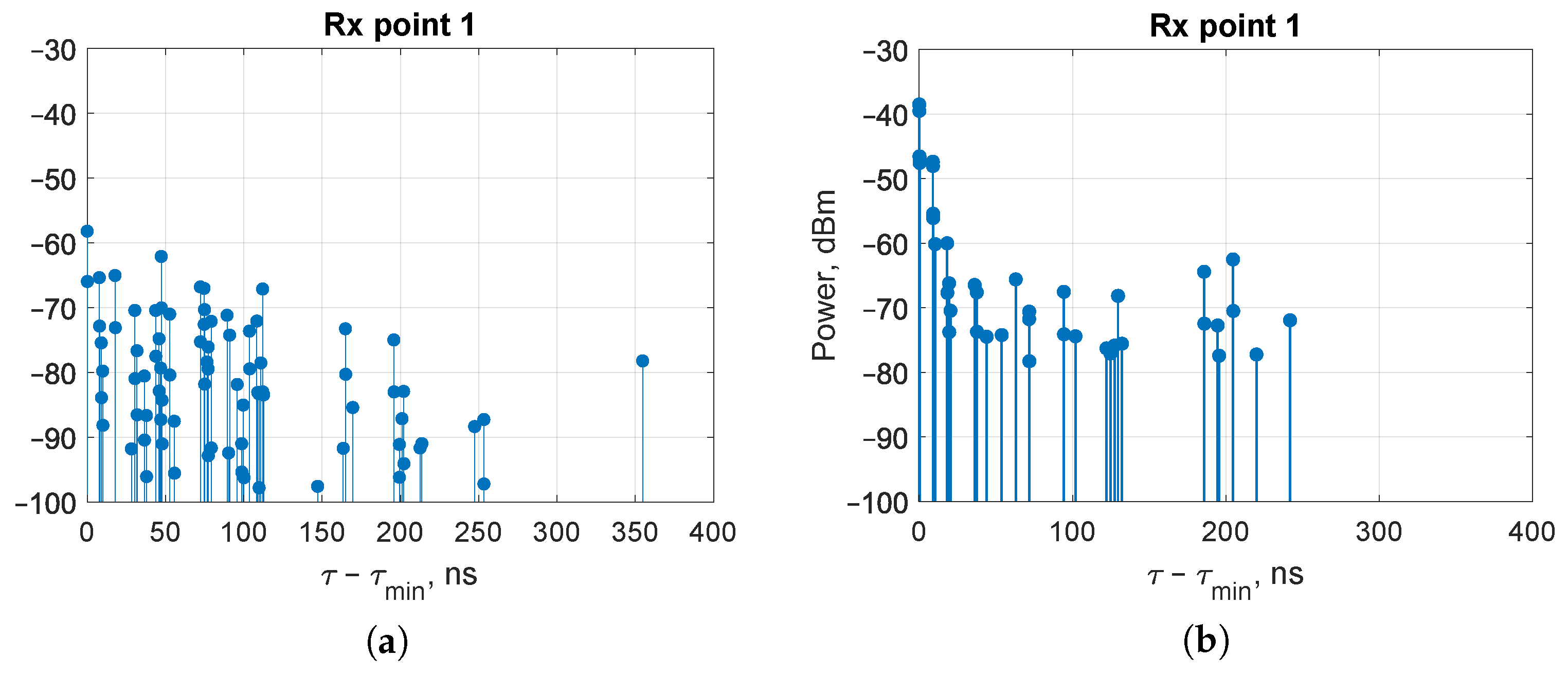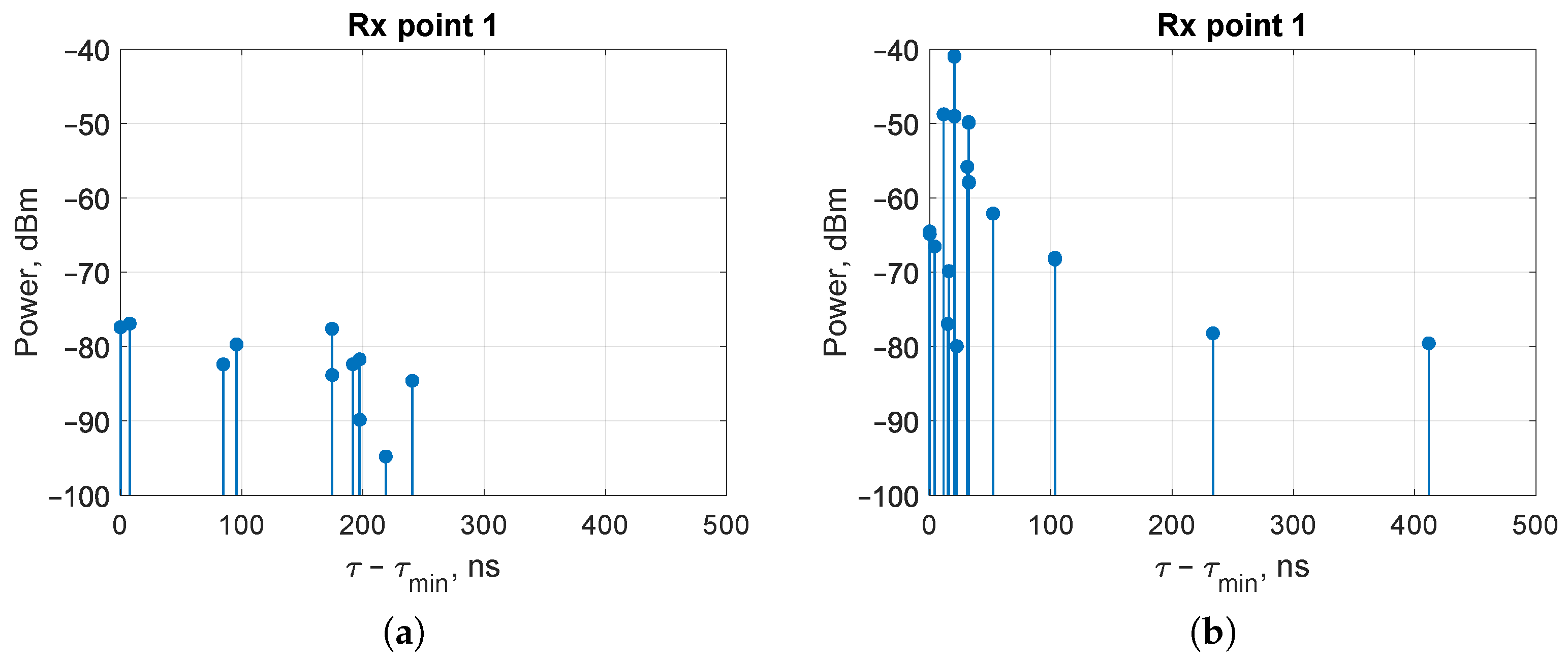 Figure 9. Power delay profile at receiver point #1 for InF-DH (a) and InF-DL (b), f 0 = 2.4 GHz.