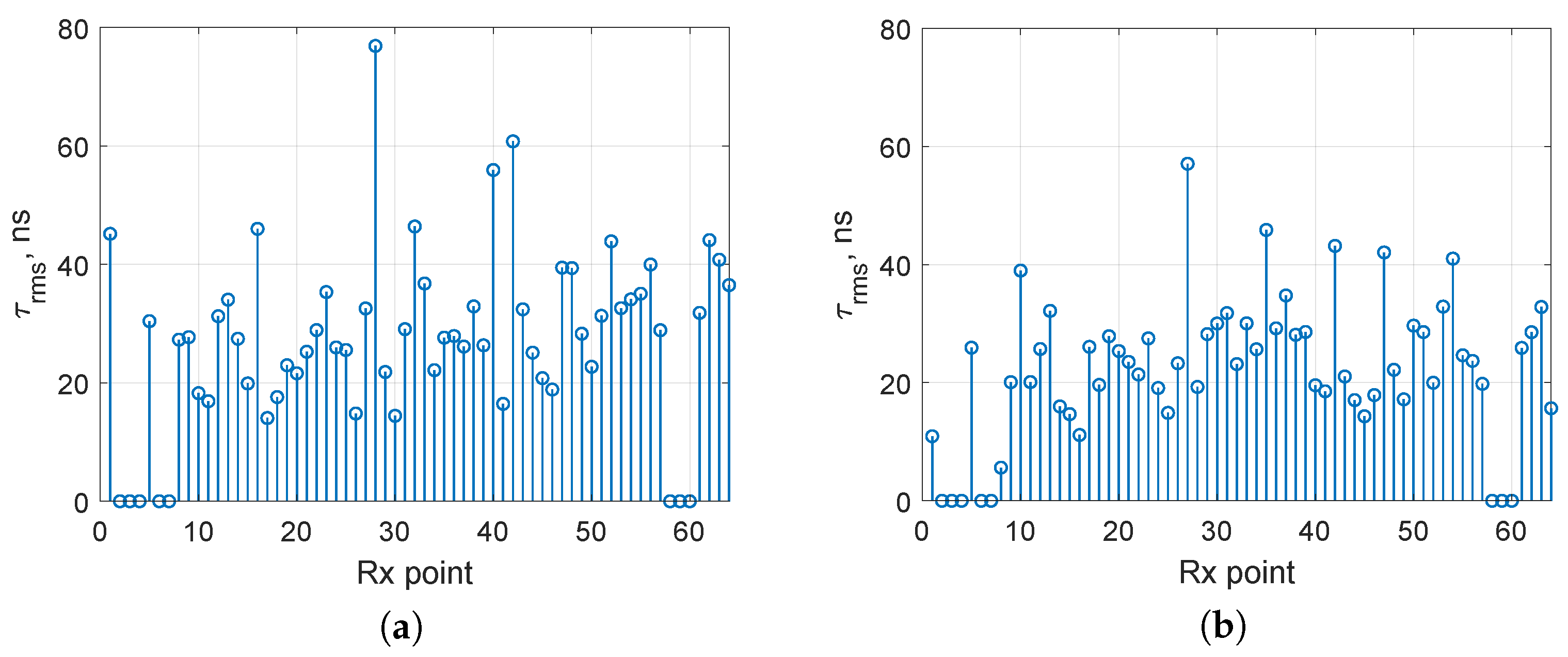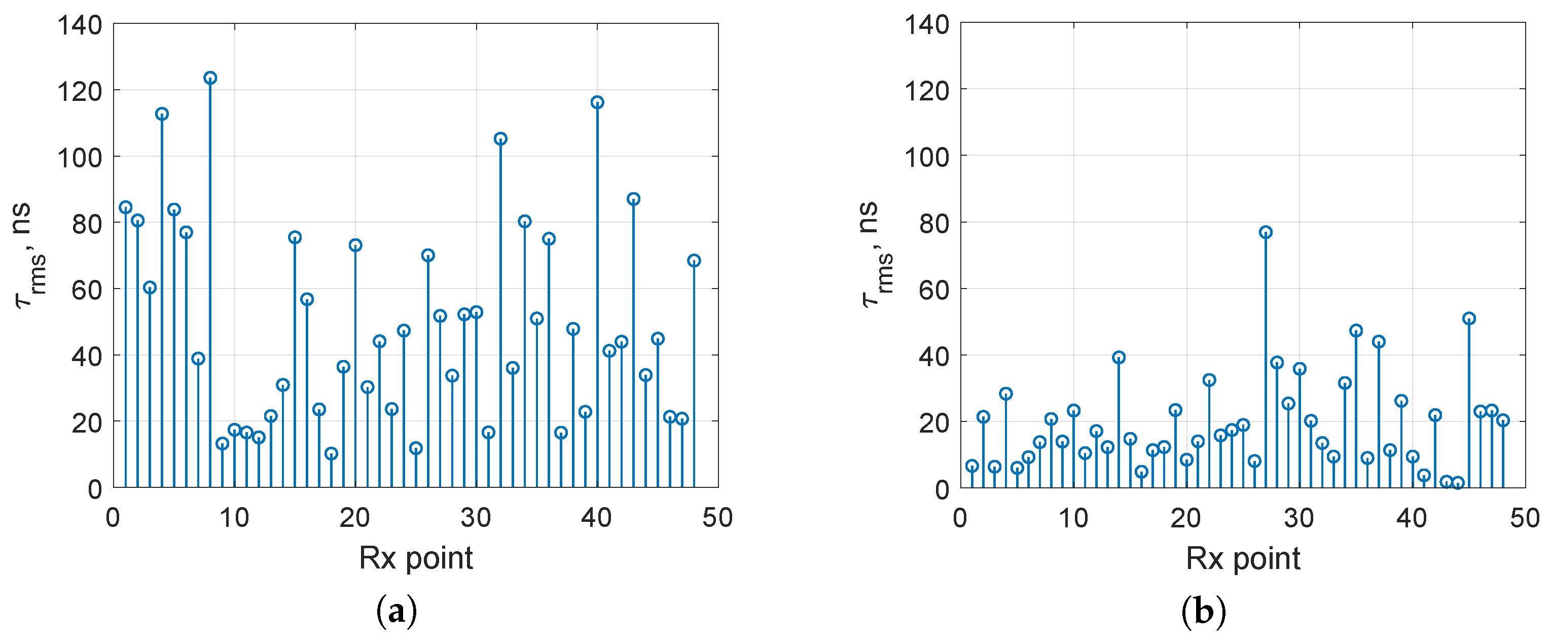 Figure 10. Root mean square delay spread τ rms for InF-DH (a) and InF-DL (b), f 0 = 2.4 GHz.