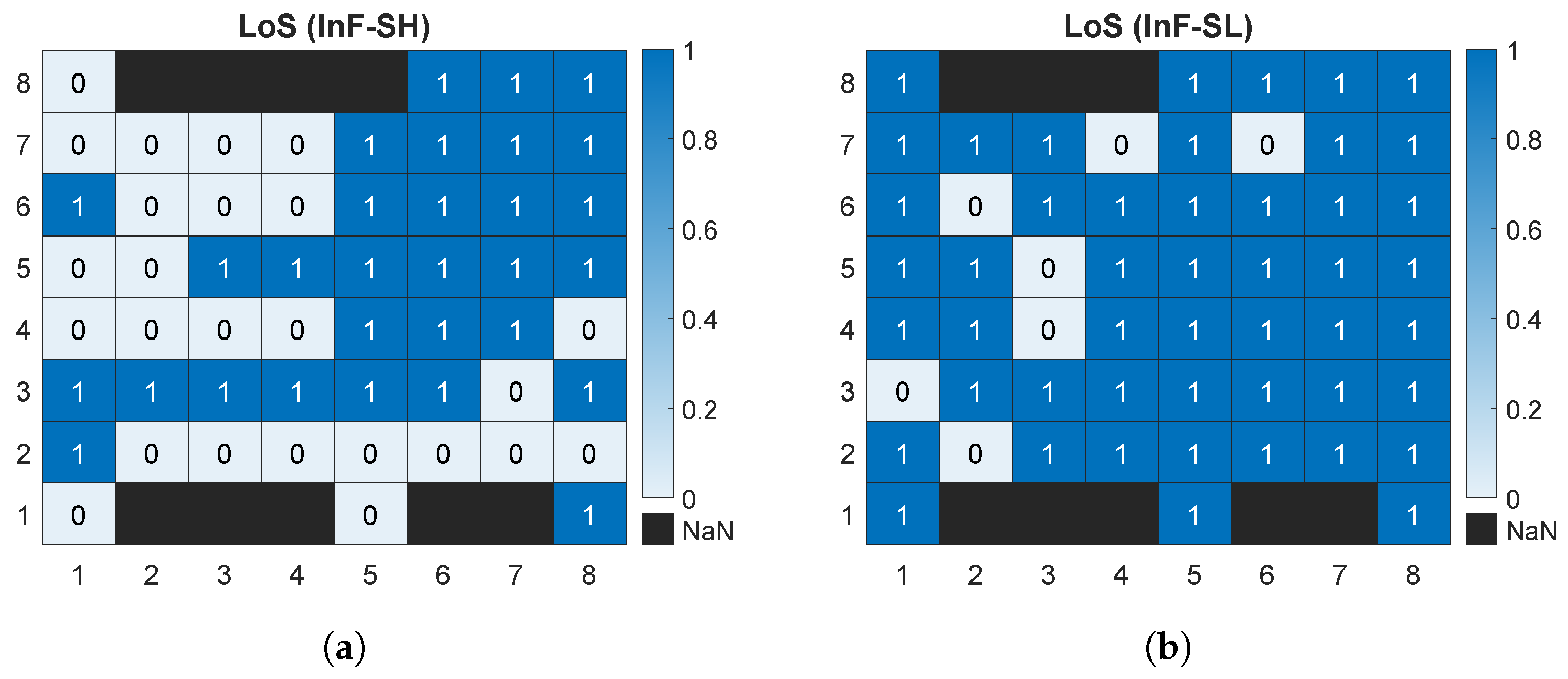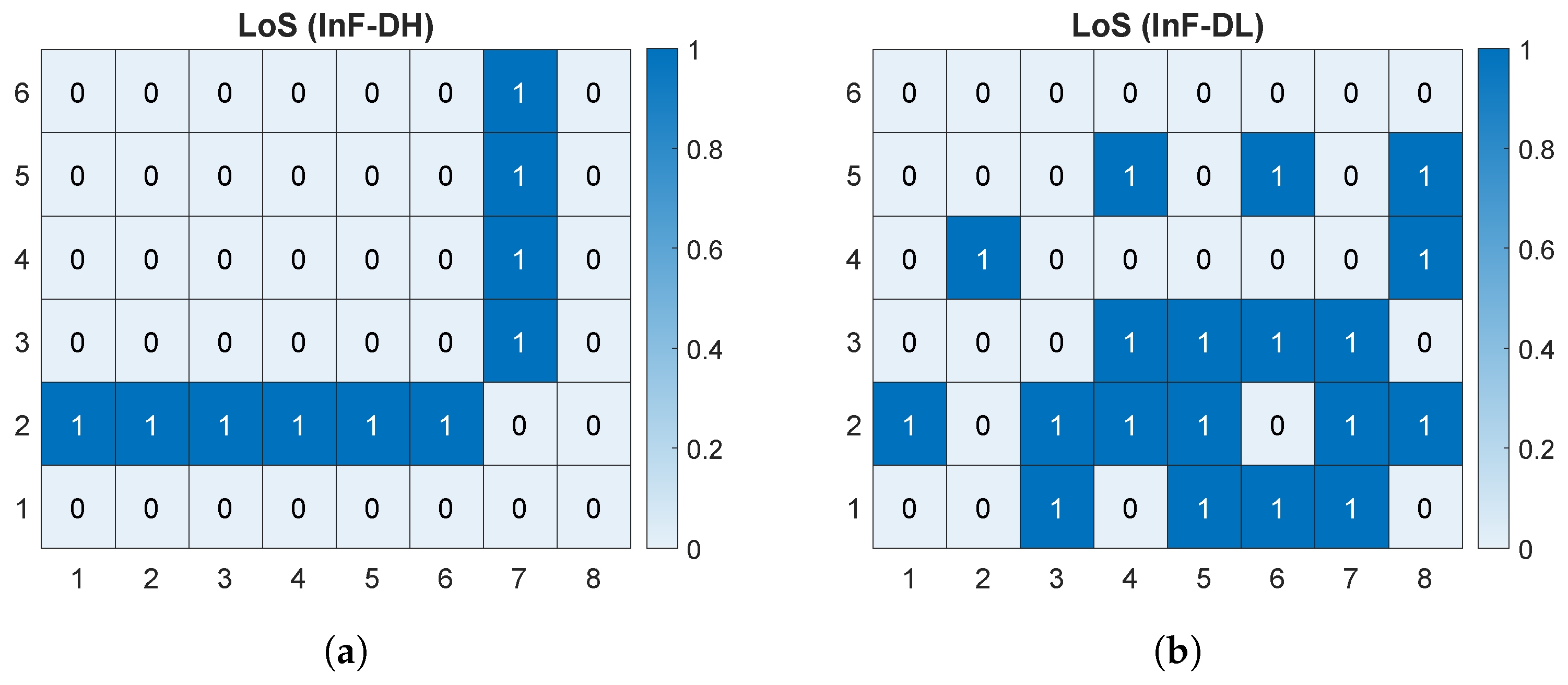 Figure 7. Number of line-of-sight (LoS) rays at each receiver point for InF-SH (a) and InF-SL (b).