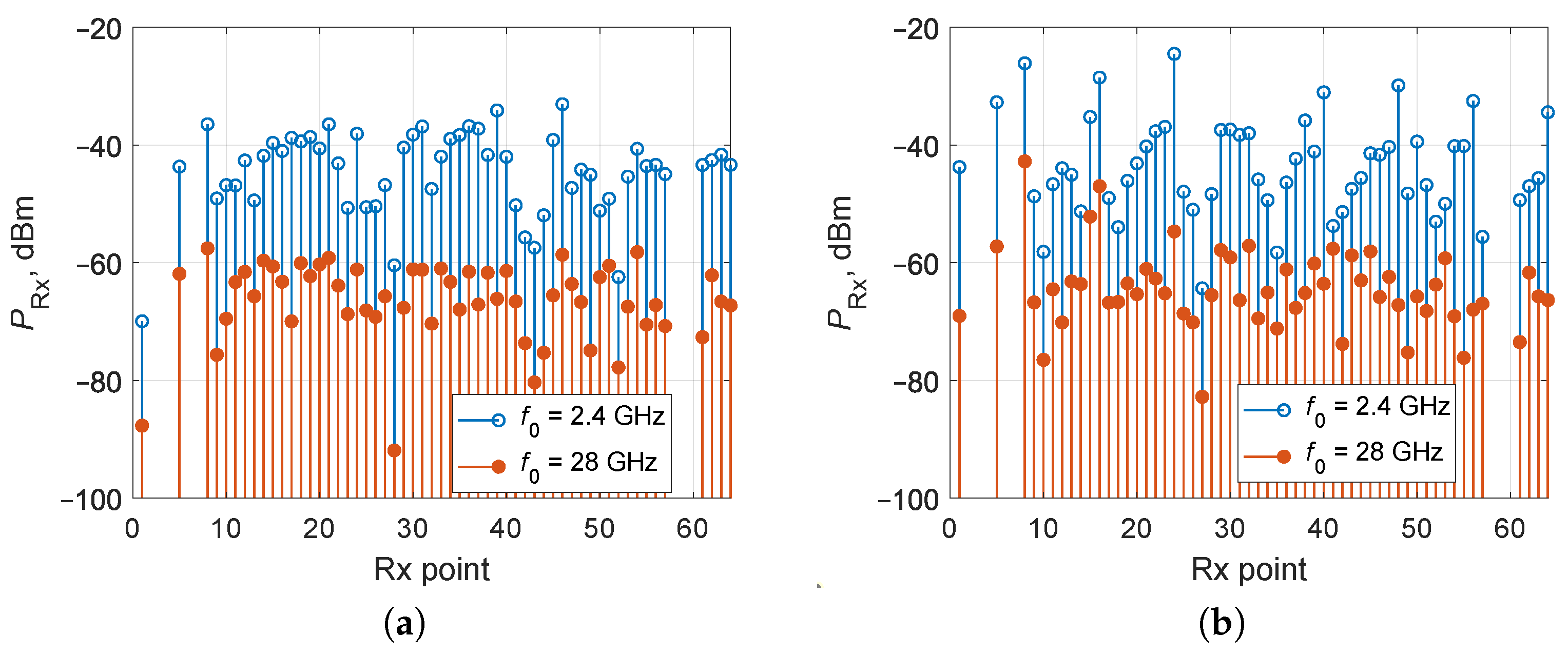 As the carrier frequency increases, the propagation loss of the rays also increases, leading to a decrease in the power of the received rays and a reduction in the overall signal power. For instance, transitioning from f 0 = 2.4 GHz to f 0 = 28 GHz for InF-SH scenario results in a decrease in received signal power up to 30 dB (Figure 8a). Transition to InF-SL scenario provides an increase in received signal power due to reduction in propagation path distance (Figure 8b). However, such a variation in received signal power has practically no effect on the values of the RMS delay spread.