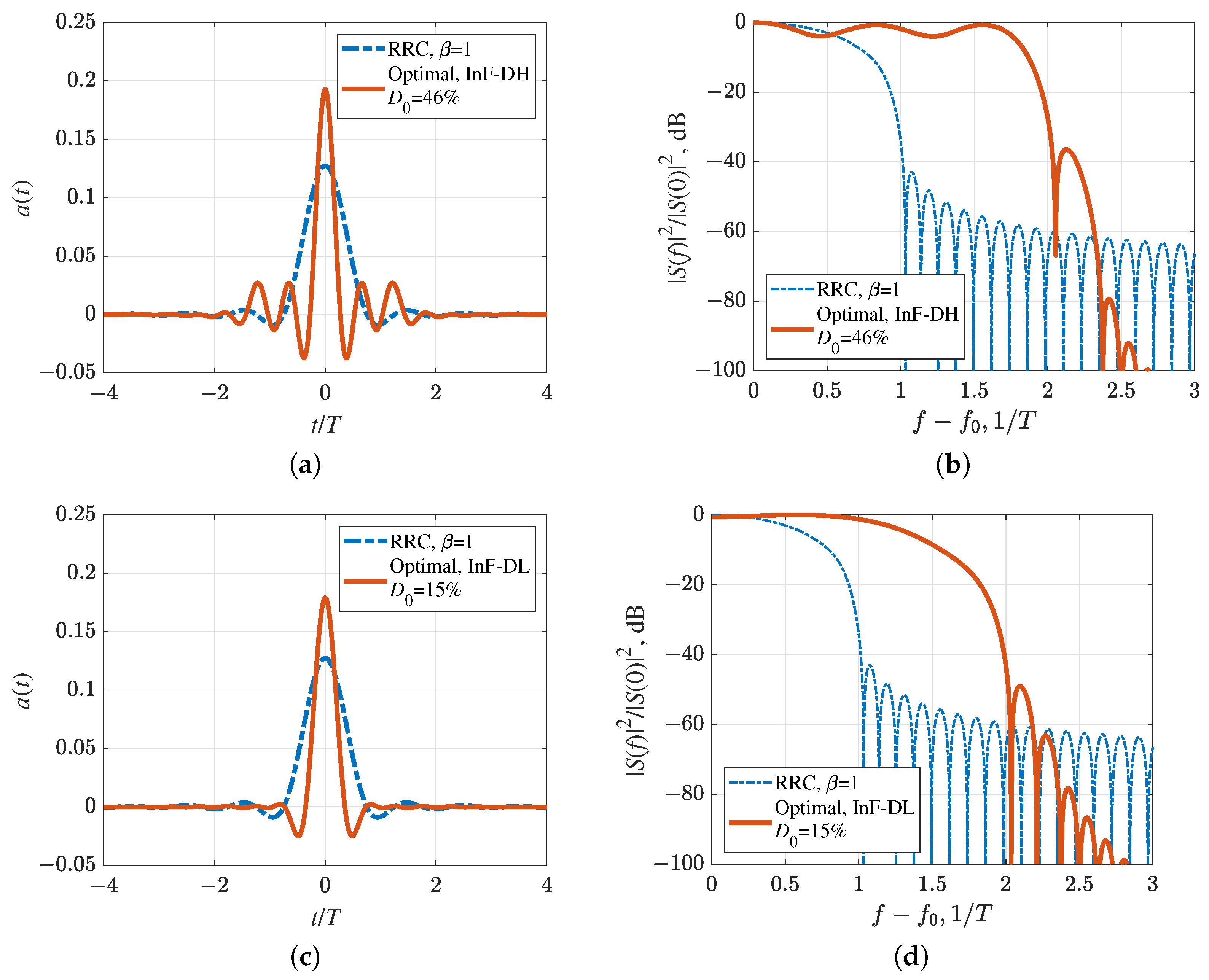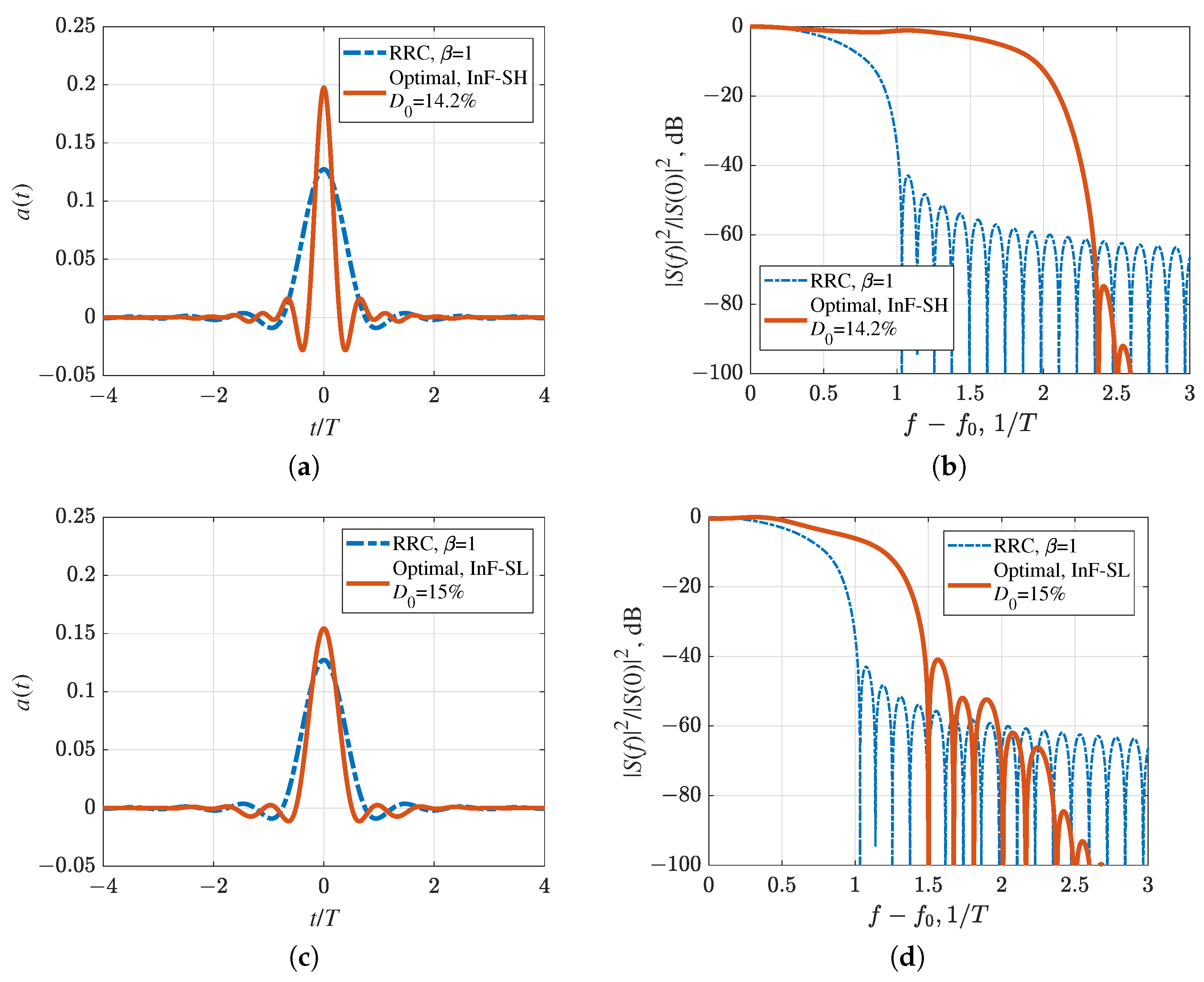 Figure 12. Optimal pulse shapes and their energy spectra compared to RRC pulse with the roll-off factor β = 1 : (a,b) InF-SH, (c,d) InF-SL.