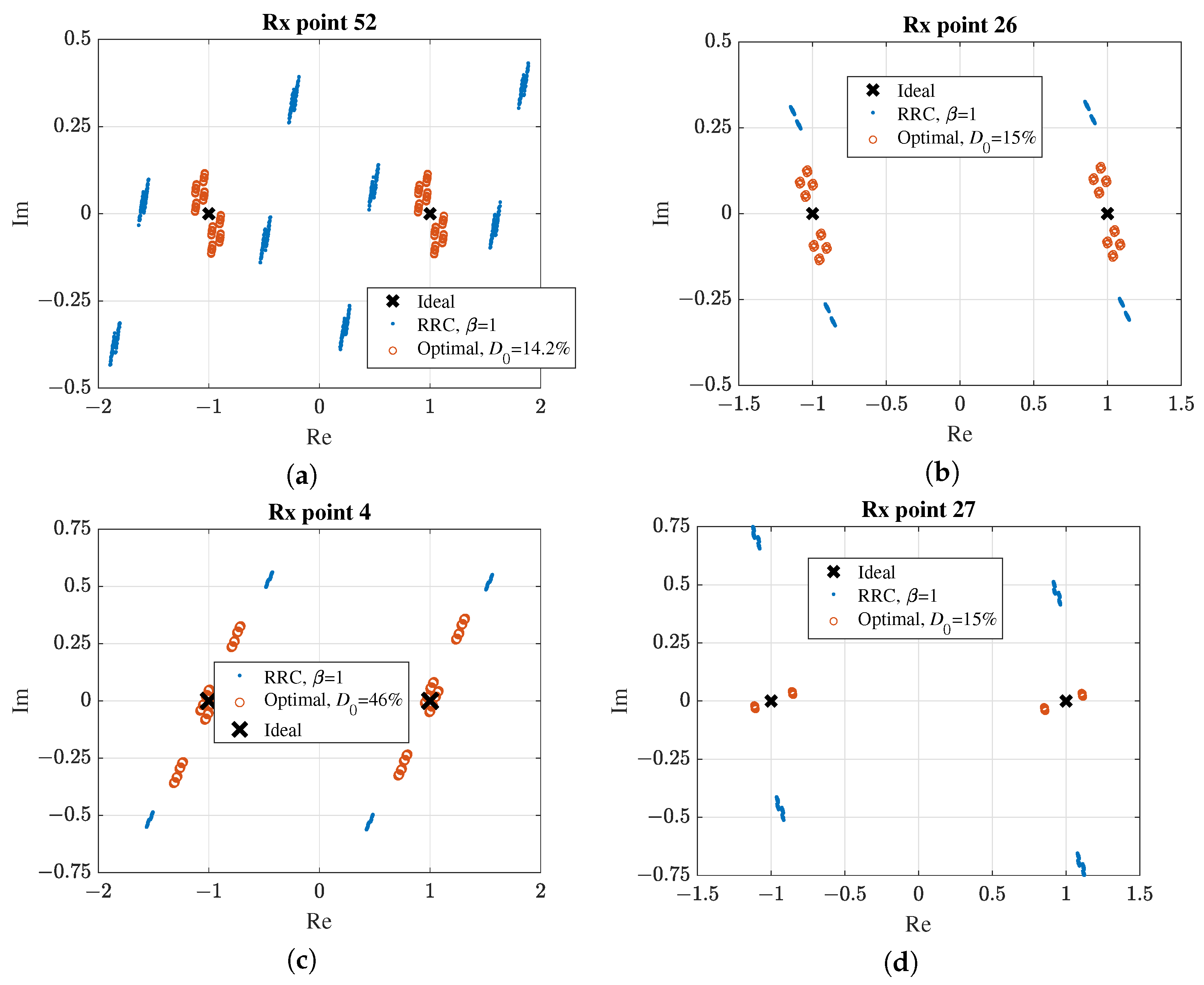 Figure 14. Signal constellation at receiver ( f 0 = 2.4 GHz) after scaling with a complex-valued coefficient: (a) InF-SH, (b) InF-SL, (c) InF-DH, (d) InF-DL.