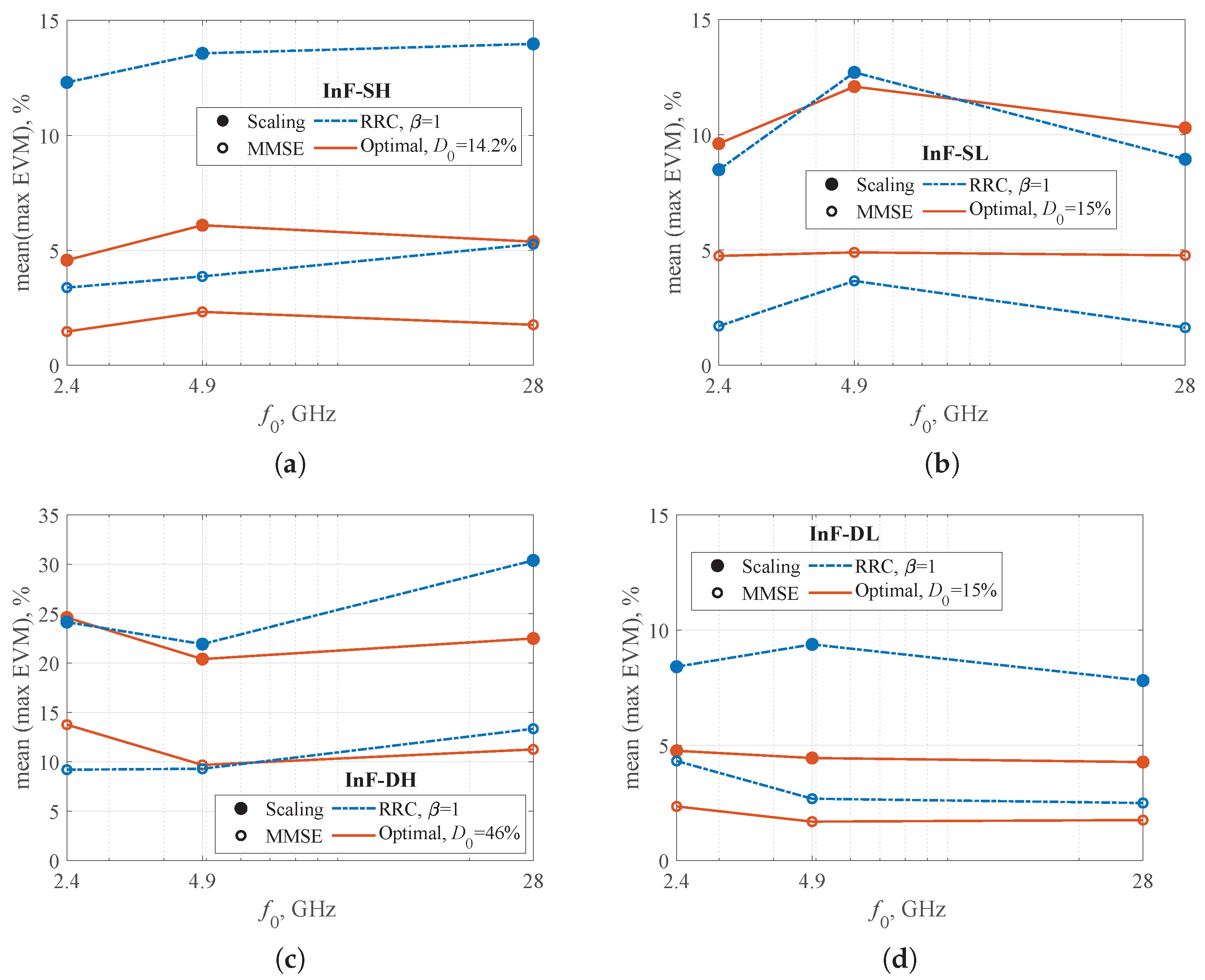 Figure 15. Maximum EVM averaged over all receiver points vs. carrier frequency: (a) InF-SH, (b) InF-SL, (c) InF-DH, (d) InF-DL.