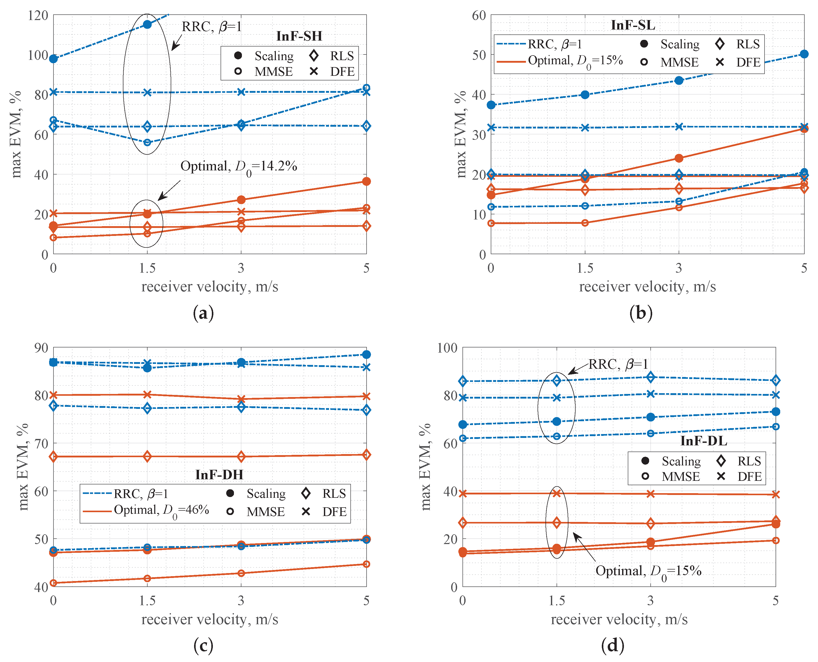 Figure 16. Maximum EVM vs. receiver velocity for 1000 information bits: (a) InF-SH, (b) InF-SL, (c) InF-DH, (d) InF-DL. The blue curves correspond to RRC signals, while the red ones correpond to optimal signals.