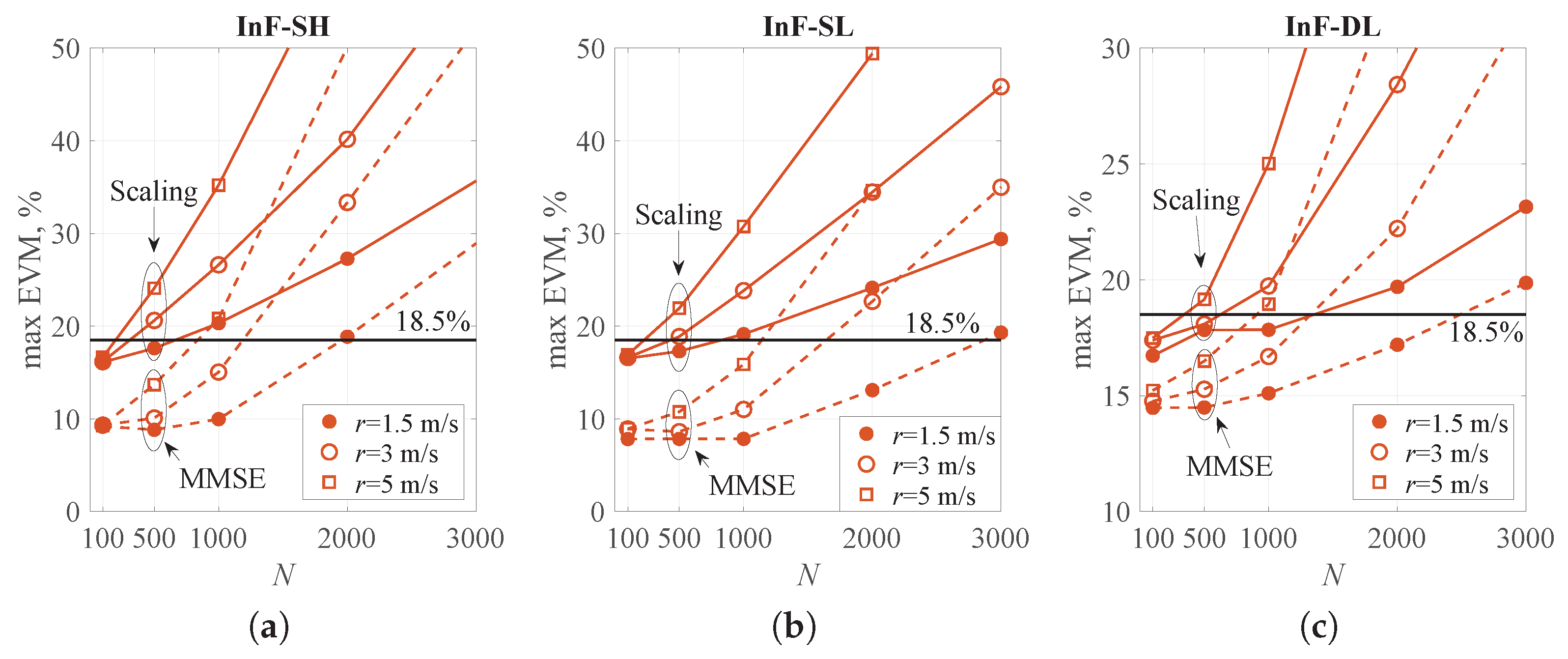 Figure 17. Maximum EVM vs. number of information symbols at different speed: (a) InF-SH, (b) InF-SL, (c) InF-DL. The solid curves correspond to scaling, while the red ones correspond to MMSE equalizer.