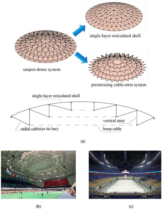 The Hikarigaoka Dome, constructed in Japan in 1994 with a span of 30 m, is recognized as the world’s first suspen-dome structure [3]. Since its inception, the use of suspen-dome structures has proliferated globally, particularly in East Asia [4,5,6,7]. In China, the first suspen-dome structure, spanning 93 m, was built for the Badminton Gymnasium at the 2008 Olympic Games [8], as shown in Figure 1b. Currently, the largest suspen-dome in Asia is the Dalian Gymnasium, spanning 145.5 m [9], as shown in Figure 1c.