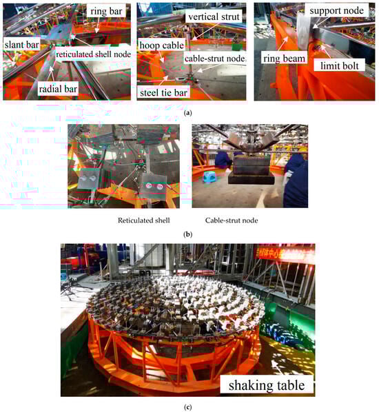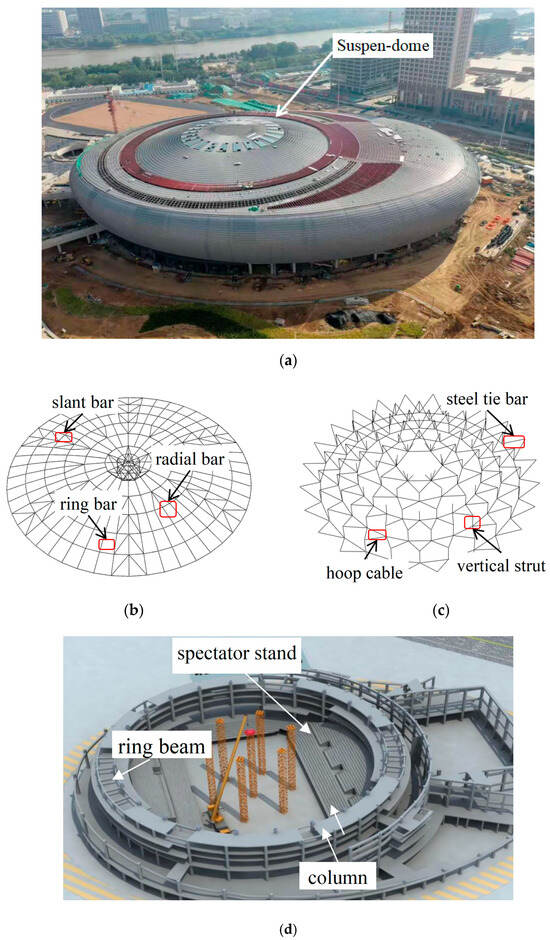 The Gymnasium of the Lanzhou Olympic Sports Center is situated in Lanzhou, China, as illustrated in Figure 2a. The gymnasium features a suspen-dome roof spanning 94 m with a structural height of 8 m. This structure comprises a ribbed single-layer lattice shell and a Levy-type cable-strut system, as depicted in Figure 2b,c. The reticulated shell is composed of 528 bars and 253 nodes (Q355B steel), and the cable-strut system includes 5 hoop cables, 90 vertical struts and 186 steel tie bars. The materials and cross-sectional properties of all structural components are detailed in Table 1.
