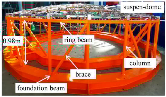 Previous studies on suspen-dome structures, whether theoretical or experimental, have primarily focused on the upper suspen-dome roof structure, largely neglecting the influence of substructures. In reality, most long-span spatial structures are constructed on concrete or steel substructures, which often amplify the input seismic load [14]. In many cases, the vibrations of the substructure can induce significant seismic forces on the upper roof structure, and these forces vary depending on the substructure’s stiffness [15].
